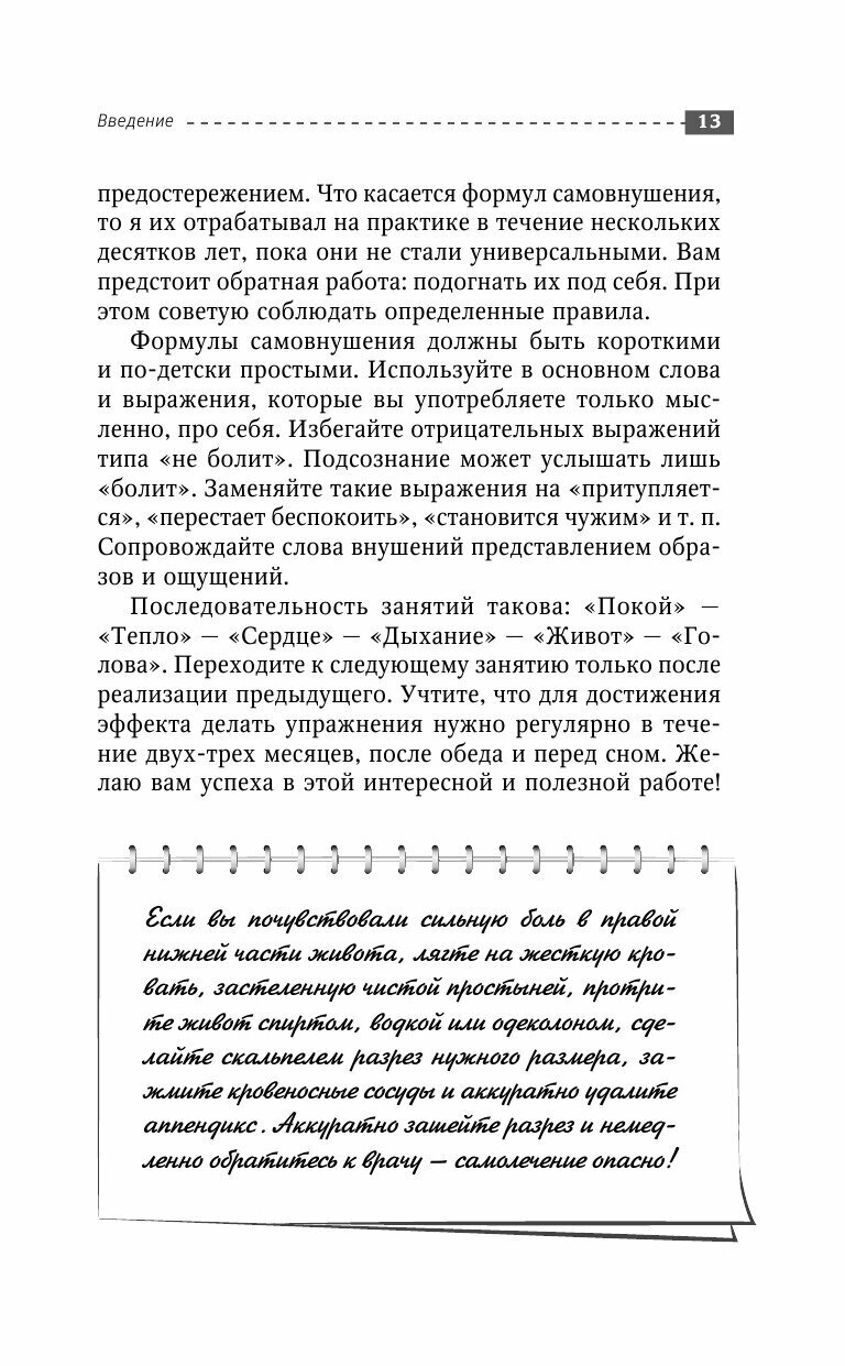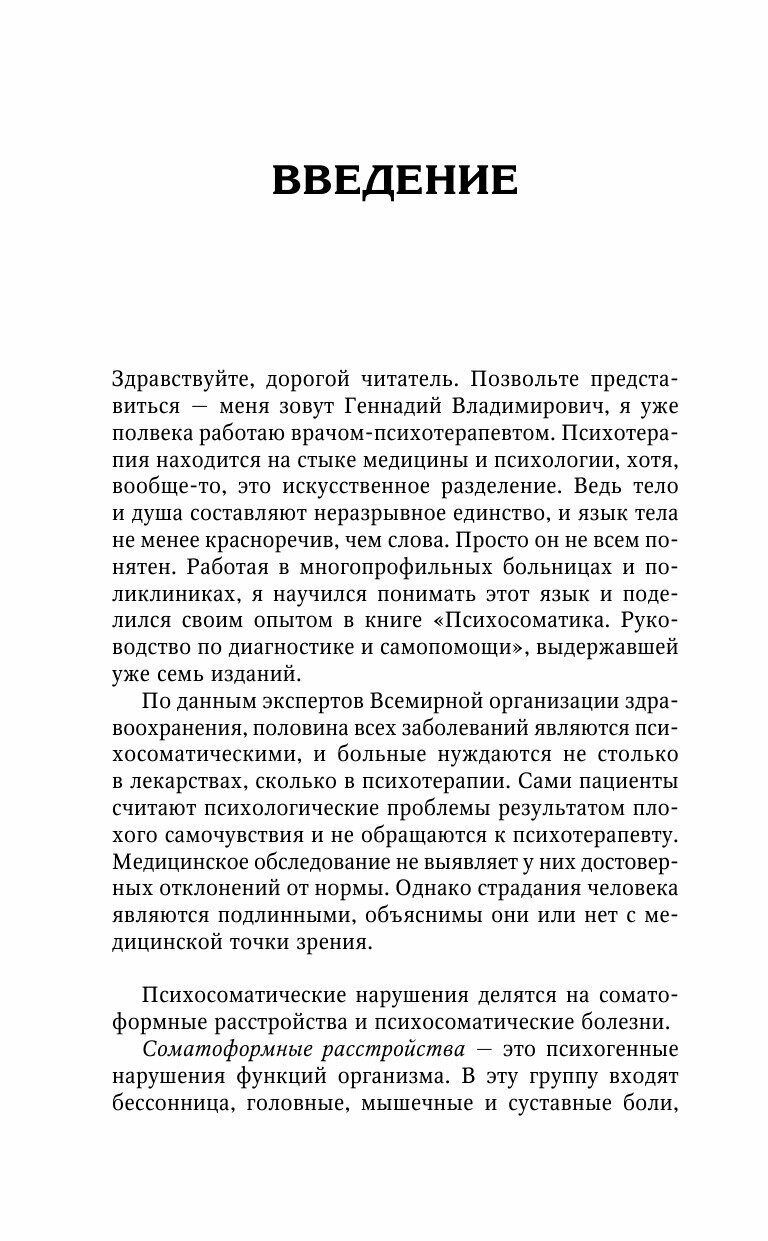 В данном руководстве знаменитый психотерапевт Г. В. Старшенбаум предлагает универсальную расшифровку «языка» психики и дает рекомендации по диагностике как традиционных психосоматических болезней (гипертонической, ишемической, язвенной и т. д.), так и по выявлению нарушений питания, сна и половой жизни, психогенных нарушений функций внутренних органов, а также истерических, ипохондрических и депрессивных соматических синдромов.