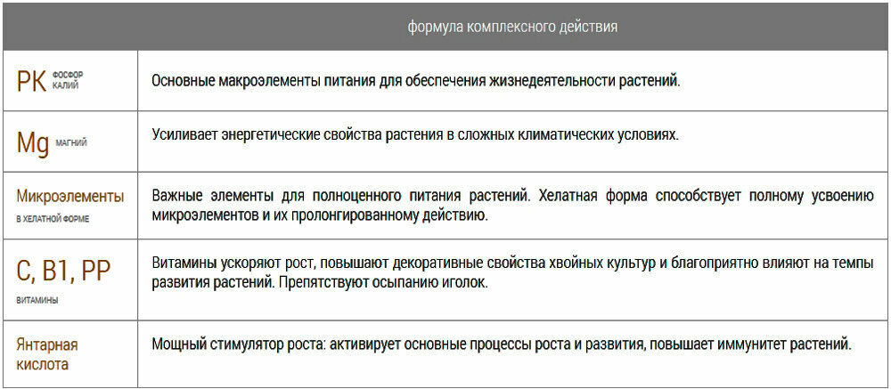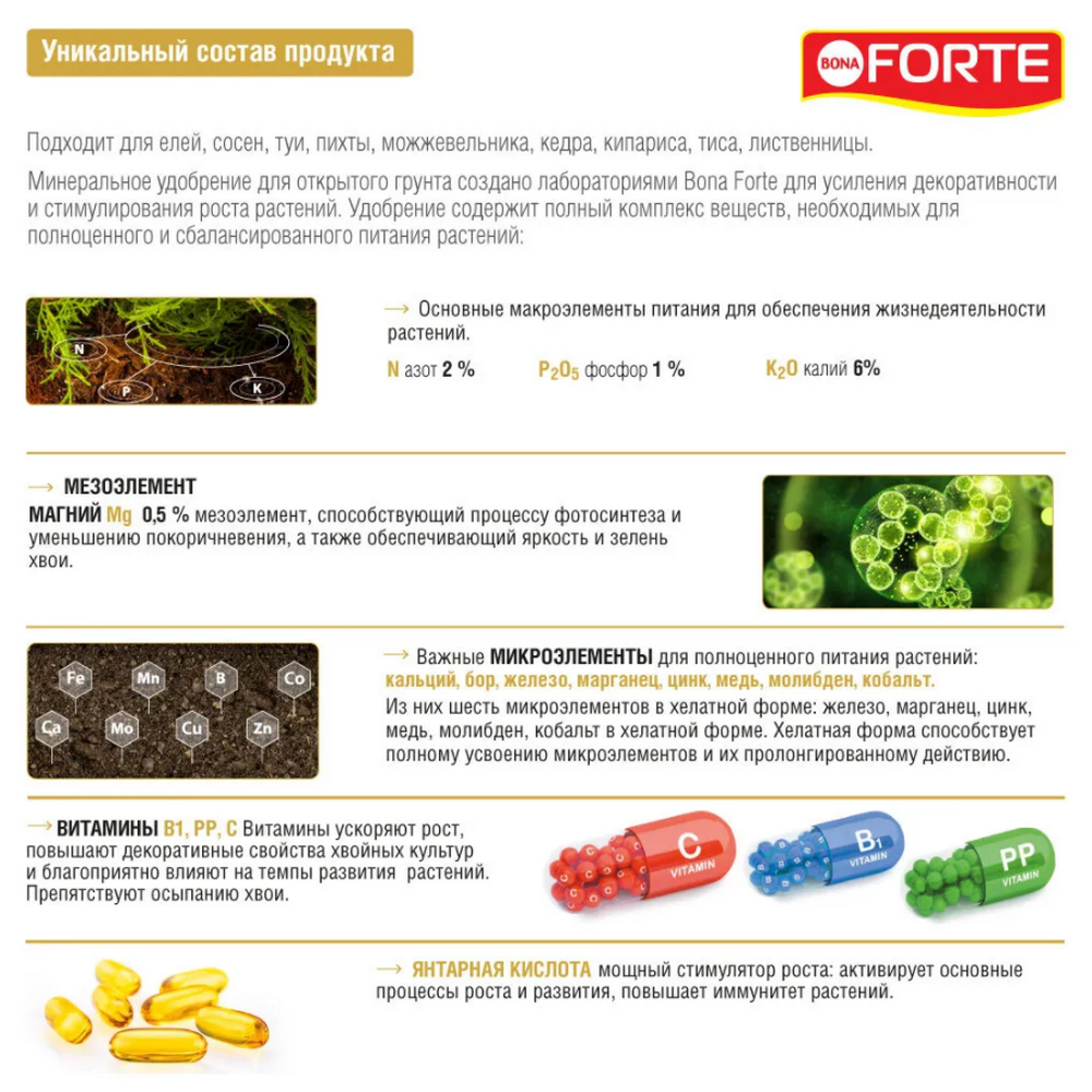 Подходит для елей, сосен, кипарисов, тиса, кедра, можжевельника, туи, пихты, лиственницы и других хвойных растений. Сбалансированный многокомпонентный состав: N: P: K + Mg + TE + V +SA - азот, фосфор, калий (2:1:6) + магний (0,5) + микроэлементы в легкоусваиваемой форме + 3 витамина + янтарная кислота.