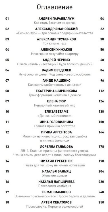 Когда читаешь, есть о чем задуматься. Читается легко, изложение краткое, ёмкое, без «воды», всё по делу. Подкупает то, что в одном проекте собраны рекомендации 17 разных коучей в области финансов и предпринимательства.