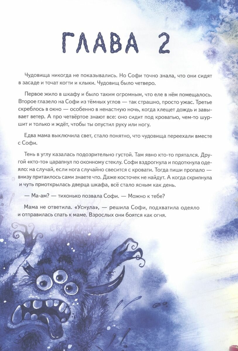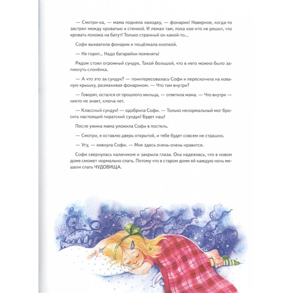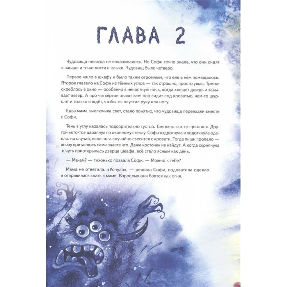 Маленькой Софи по ночам не дают спать чудовища. Однажды девочка находит ключ от старого сундука, в котором хранится загадочный дневник охотника за чудовищами. Там рассказано, как прогнать каждого из них: огромный Шкафффер терпеть не может лимонада, Хват-Подкроват – яблок, Страхотень из тёмного угла боится соли, а Шкряб, царапающий оконные стёкла по ночам, – сахара. Но чтобы победить чудищ раз и навсегда, нужно узнать их главный секрет. В этой книге вы найдёте не только смешную историю про приключения маленькой девочки, но и советы для родителей, как помочь ребёнку справиться со своими страхами.
