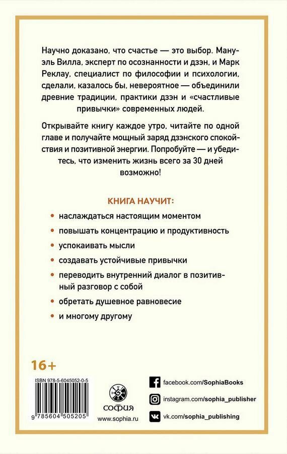 Научно доказано, что счастье — это выбор. Мануэль Вилла, эксперт по осознанности и дзэн, и Марк Реклау, специалист по философии и психологии, сделали, казалось бы, невероятное — объединили древние традиции, практики дзэн и «счастливые привычки» современных людей.