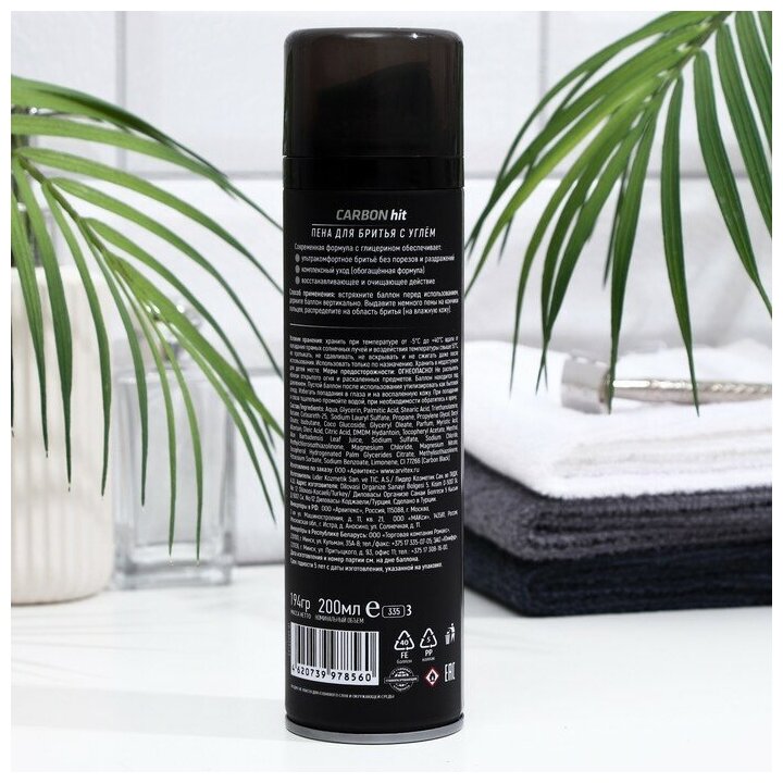 | Состав | Aqua, Glycerin, Palmitic Acid, Stearic Acid, Triethanolamine, Butane, Ceteareth-25, Sodium Lauryl Sulfate, Propane, Propylene Glycol, Decyl Oleate, Isobutane, Coco Glucoside, Glyceryl Oleate, Parfum, Myristic Acid, Allantoin, Oleic Acid, Citric Acid, DMDM Hydantoin, Tocopheryl Acetate, Menthol, Aloe Barbadensis Leaf Juice, Sodium Sulfate, Sodium Chloride, Methylchloroisothiazolinone, Magnesium Chloride, Magnesium Nitrate, Tocopherol, Hydrogenated Palm Glycerides Citrate, Methylisothiazolinone, Potassium Sorbate, Sodium Benzoate, Limonene, CI 77266 (Carbon Black). |