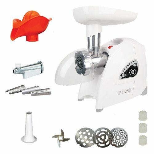 В комплекте поставляются три перфорированных диска для фарша, насадка для приготовления колбас и соковыжималка. Также есть специальный защитный экран, который предотвращает попадание рук внутрь мясорубки во время работы.