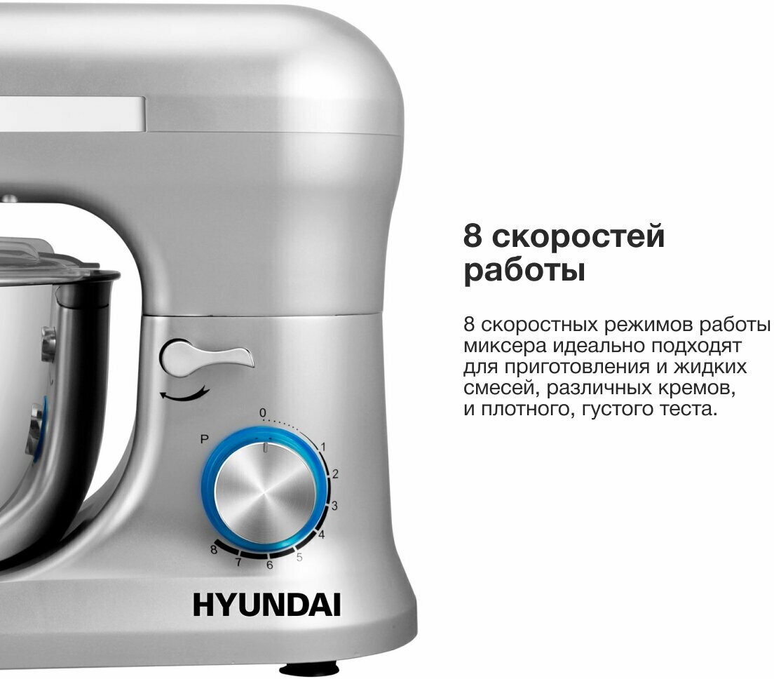 Тип: Миксер стационарный; Мощность: 1300 Вт; Число скоростей: 8; Количество насадок: 3; Насадки: венчик; Прорезининая ручка: нет; Защитная крышка на чашку: да; Цвет: серебристый; Прочие особенности и свойства: Планетарный миксер Hyundai поможет ускорить и облегчить приготовление самых изысканных блюд. Высокая мощность 1300Вт позволяет в считанные минуты справиться с любой кулинарной задачей. В комплекте: лопатка для перемешивания, венчик для взбивания, крюк для теста и защитная крышка для чаши. 8 скоростных режимов работы миксера идеально подходят для приготовления и жидких смесей, различных кремов, и плотного, густого теста. Благодаря вместительной чаше на 4,5 литра и оптимальному положению насадок, миксер с легкостью справляется как с обработкой большого объема продуктов, так и с небольшим количеством ингредиентов. Дополнительные аксессуары – силиконовая лопатка и разделитель белка и желтка упрощают работу с прибором и делают процесс готовки еще приятнее.