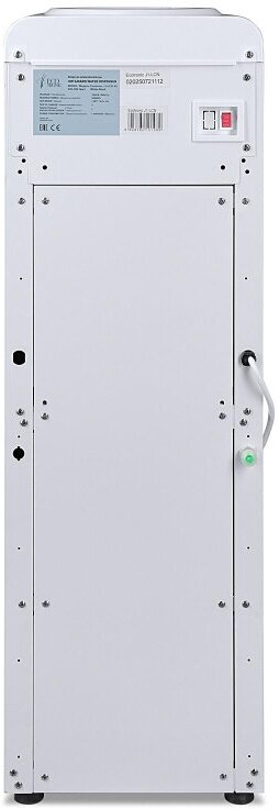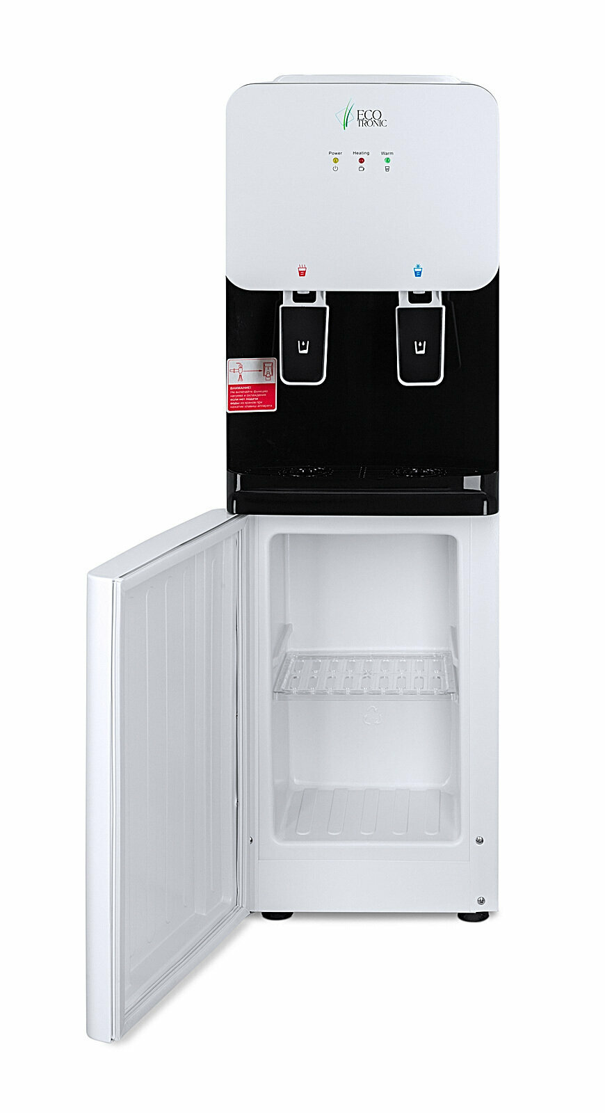 Компактный кулер для воды без охлаждения, только нагрев. С небольшим шкафчиком в нижней части. Корпус белого цвета с черной вставкой в области кранов подачи воды. Индикация режимов работы, нагрева и готовности воды. Краны «нажим кружкой».