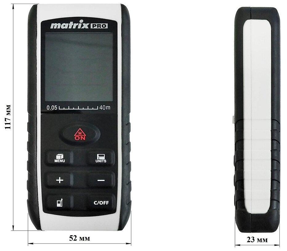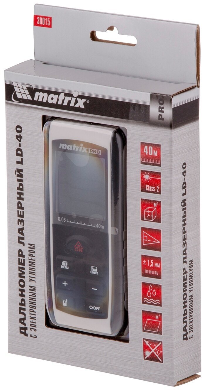 | Прочие особенности | Лазерный дальномер LD-40 торговой марки Matrix предназначен для измерения линейных расстояний и углов, вычисления площадей и объемов,Легкое и компактное устройство, корпус изготовлен из прочного ABS-пластика с резиновыми антискользящими накладками,Дальномер имеет диапазон измерения от 0,05 до 40 м с точностью ±1,5 мм,Оснащен электронным угломером с диапазоном измерения от 0 до 60 градусов,Предусмотрен необходимый набор дополнительных опций:суммирование и вычитание показаний, вычисление площади и объема, вычисления по теореме Пифагора,Установлена функция автоматического выключения лазера (через 30 с) и отключения устройства (через 180 с),Работает от двух батареек типа ААА |