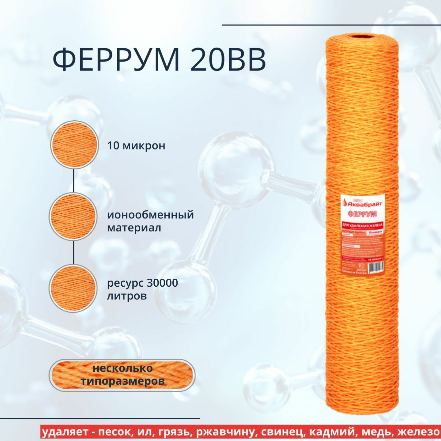 Аксессуар Аквабрайт позволяет уменьшить не только содержание железа в воде, но и песка, грязи, ржавчины размером до 10 мкм. Для снижения концентрации этих загрязнений в холодной воде достаточно установить такой картридж из из полипропиленового шнура с волокнистым катионитом с ионообменом.