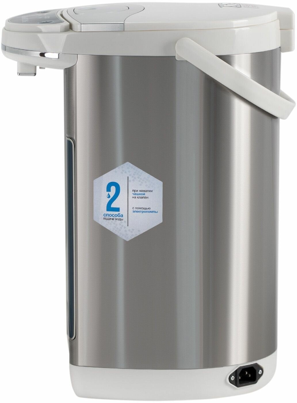 | Прочие особенности и свойства | Термопот имеет 2 способа подачи воды: нажатием чашкой на клапан и при помощи кнопки на панели управления «Подача воды». |