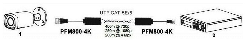 PFM800-4K предназначен для передачи видеосигналов через витую пару. Устройство подбирает электрический импеданс коаксиального кабеля 75Ω к электрическому импедансу симметрического кабеля, обеспечивая передачу видеосигнала на 400m (витая пара 5 категории) и ликвидирует асимметрические помехи.