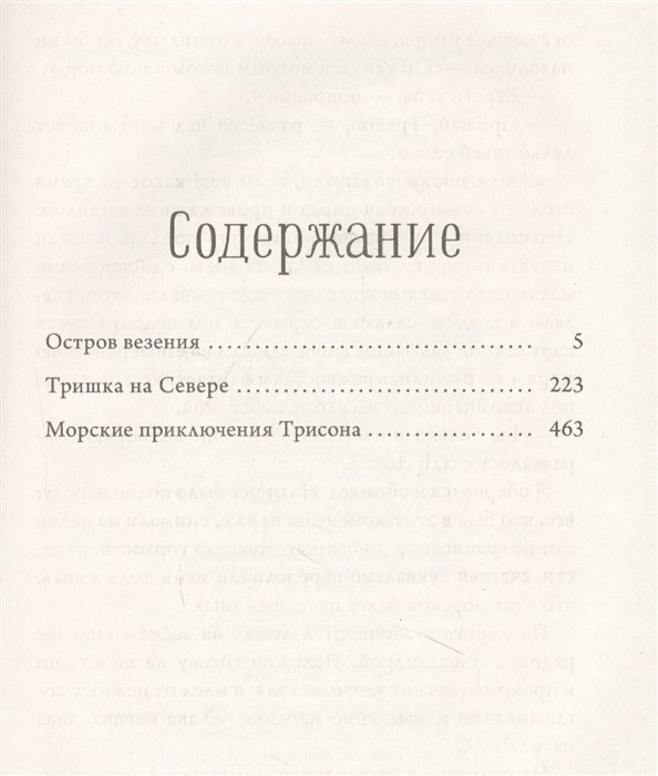 Вас ждут три невероятно увлекательные истории, написанные с юмором, теплотой и огромной любовью к этому миру: «Остров везения», «Тришка на Севере», «Морские приключения Трисона».