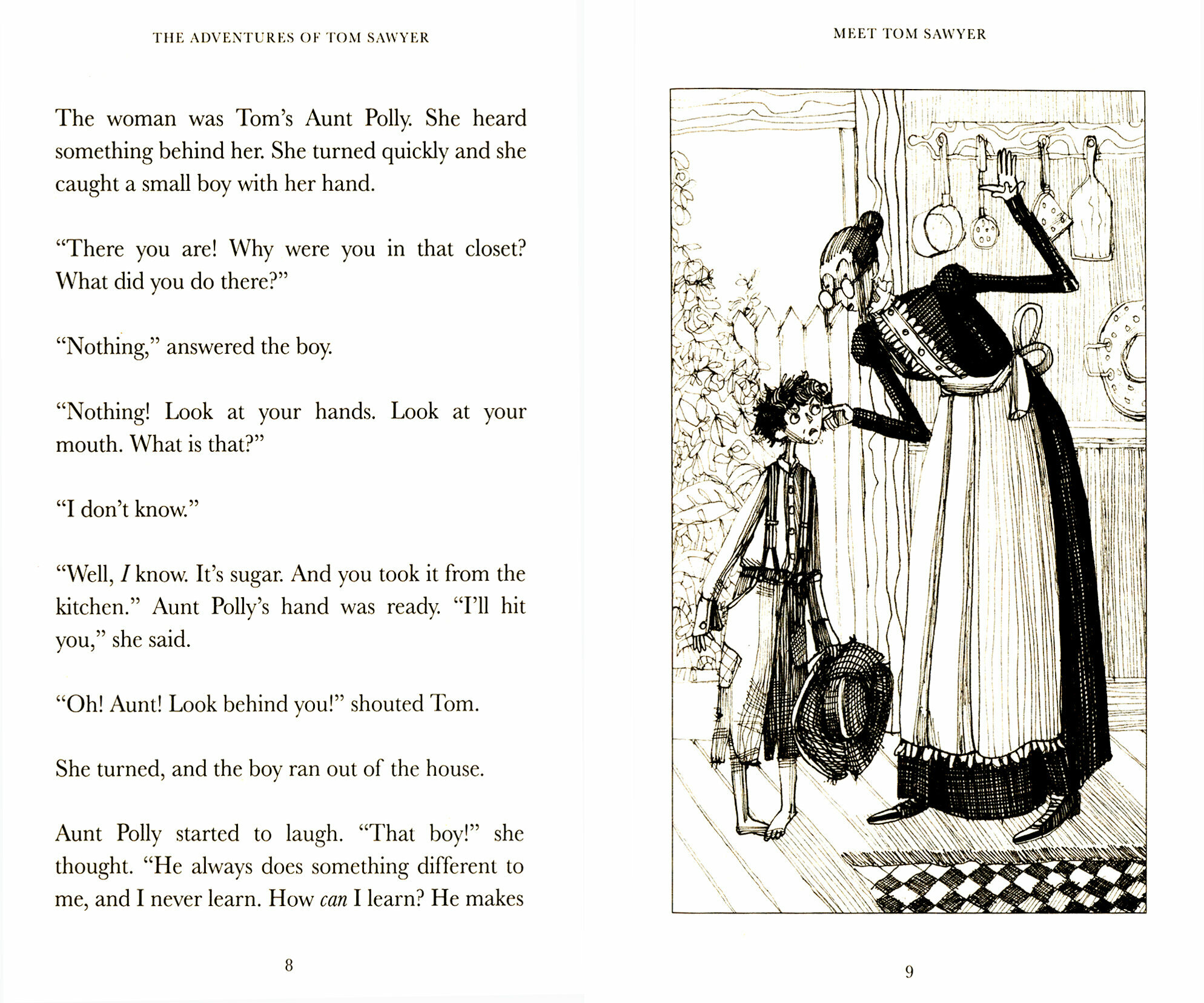 The Adventures of Tom Sawyer (1876) is the story of a boy in Missouri in the 1840s. Tom Sawyer's parents are dead and he lives with his aunt in a small village next to the long Mississippi river. One night, Tom and his friend, Huckleberry Finn see Injun Joe kill Dr Robinson. "We can't say anything about it. Or we will die," says Tom. But then the wrong man goes to prison...