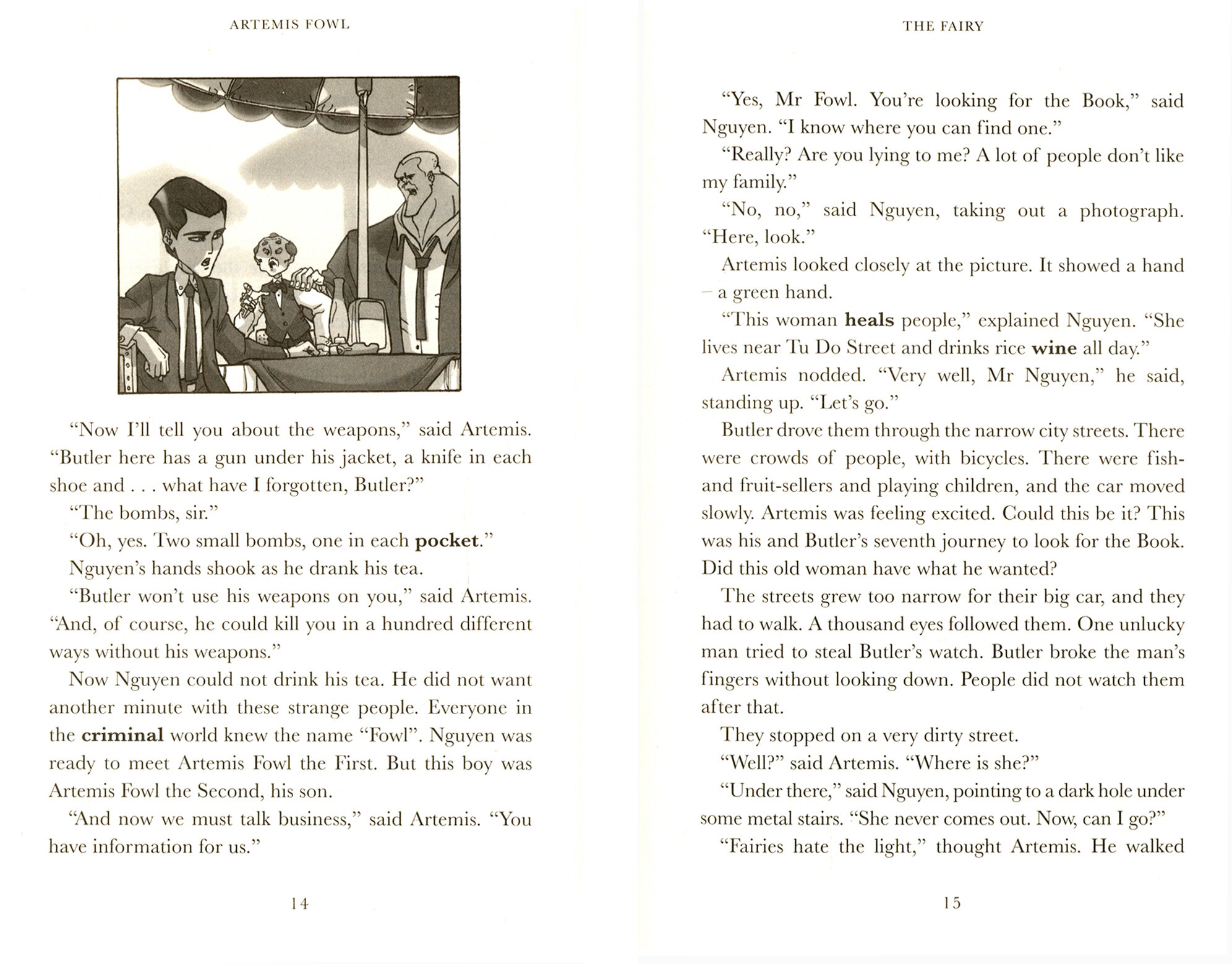 Artemis Fowl is twelve years old and he is a clever and dangerous criminal. He discovers that fairies have gold - a lot of gold - and he wants some of it. But these fairies are not the fairies you read about in children's books. They are not sweet and friendly. They have guns, and they are ready to fight.