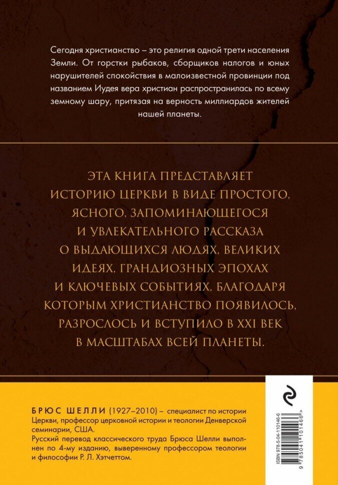 Эта книга представляет историю церкви в виде простого, ясного, запоминающегося и увлекательного рассказа о выдающихся людях, великих идеях, грандиозных эпохах и ключевых событиях, благодаря которым христианство появилось, разрослось и вступило в XXI век в масштабах всей планеты. Труд профессора Брюса Шелли (1927-2010) стал классическим. Русский перевод выполнен по 4-му изданию, выверенному профессором теологии и философии Р. Л. Хэтчеттом.