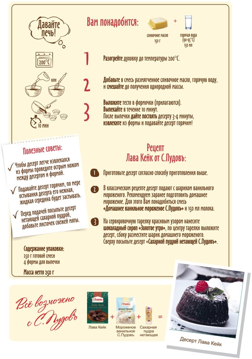 Приготовить этот уникальный десерт дома вам поможет смесь для выпечки Лава Кейк от С.Пудовъ. Готовые лава кейки следует подавать горячими, пока шоколадная масса внутри ещё не застыла. Формы для выпечки внутри!