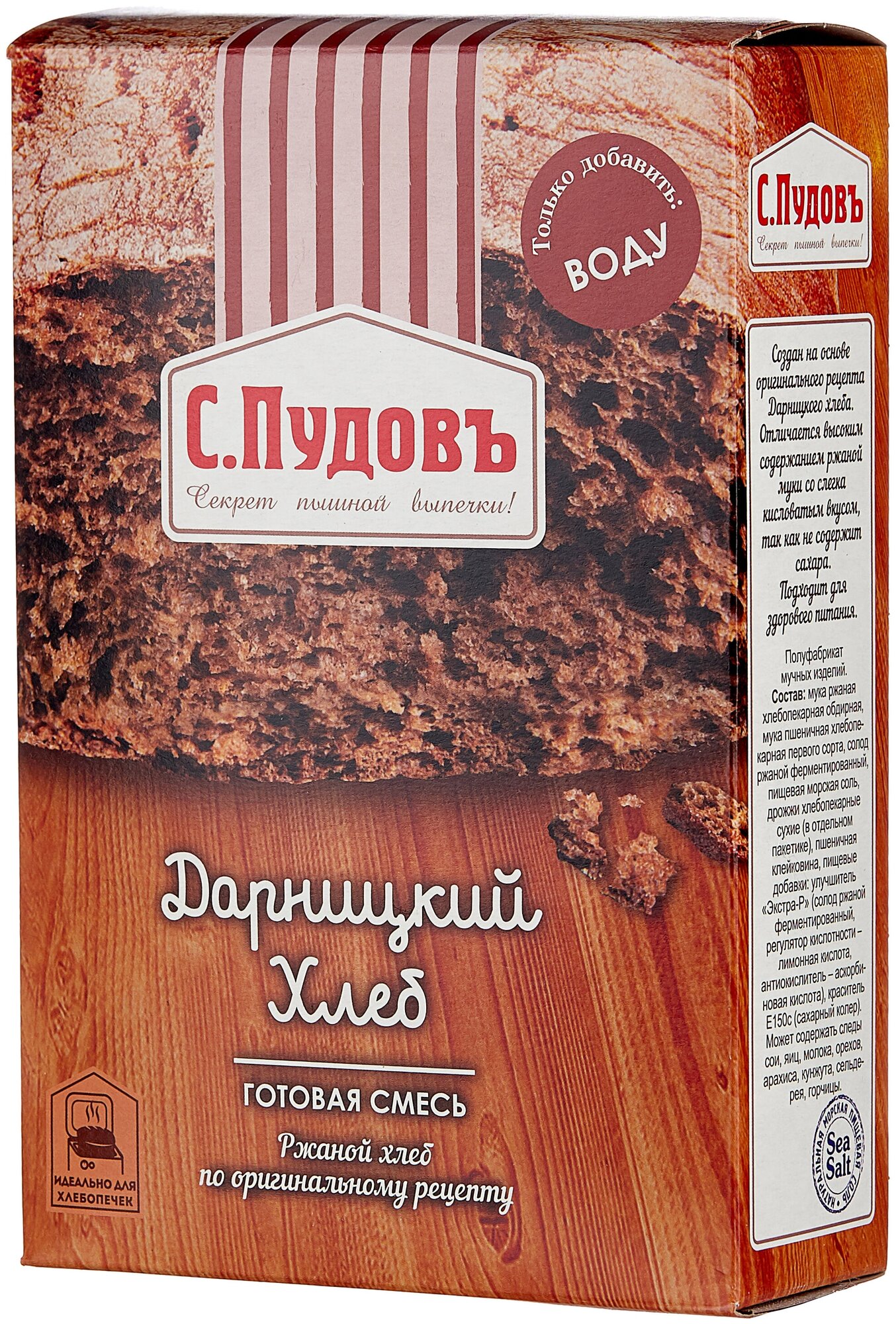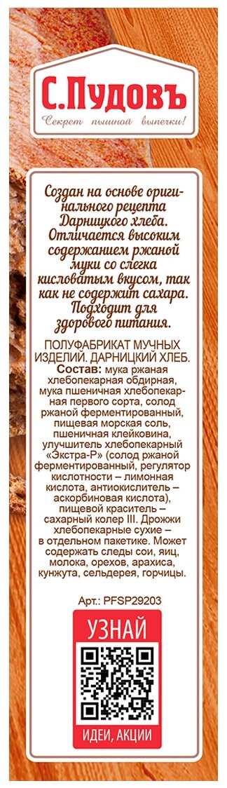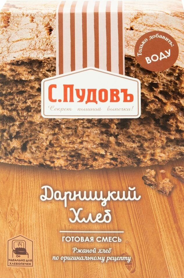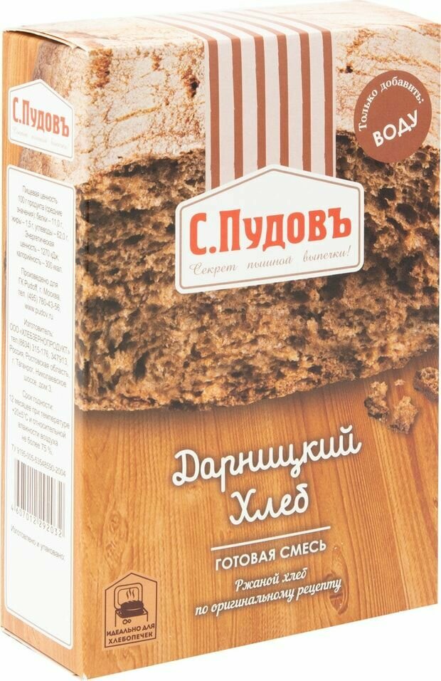 Смесь для выпечки «Дарницкий хлеб С. Пудовъ» позволит легко и просто приготовить вкусный пшенично-ржаной хлеб.Дарницкий – самый популярный хлеб в России. В готовой смеси идеальные пропорции всех ингредиентов, чтобы у вас получился вкусный и ароматный ржаной хлеб.У готового хлеба пористый и мягкий мякиш и вкусная плотная корочка.Подайте свежеиспеченный горячий хлеб как самостоятельное блюдо. Также «Дарницкий хлеб» идеально подойдёт для ваших любимых утренних бутербродов, а также супов.Мы разработали рецептуру этого хлеба так, чтобы вы получили успешный результат независимо от способа выпечки: в духовке или хлебопечке!Удивите близких этим вкусным и уникальным домашним хлебом!Состав: мука ржаная обдирная, мука пшеничная хлебопекарная первого сорта, солод ржаной ферментированный, пищевая морская соль, пшеничная клейковина, улучшитель хлебопекарный «Экстра-Р» (солод ржаной ферментированный, регулятор кислотности - лимонная кислота, антиокислитель - аскорбиновая кислота), пищевой краситель сахарный коллер III. Дрожжи хлебопекарные сухие (в отдельном пакетике). Может содержать следы сои, яиц, молока, орехов, арахиса, кунжута, сельдерея, горчицы.Пищевая ценность (на 100 г продукта): белки – 11 г, жиры – 1,5 г, углеводы – 62 г,Энергетическая ценность/калорийность- 1300 КДж/310 КкалСрок годности: 12 месяцев. Хранить при температуре +20±5С и относительной влажности воздуха не более 75%.