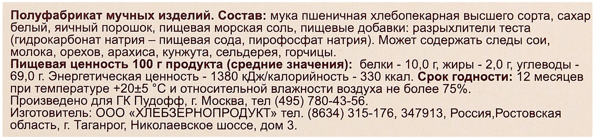 | Состав | мука пшеничная хлебопекарная высшего сорта, сахар белый, яичный порошок, пищевая поваренная морская соль, пищевые добавки |