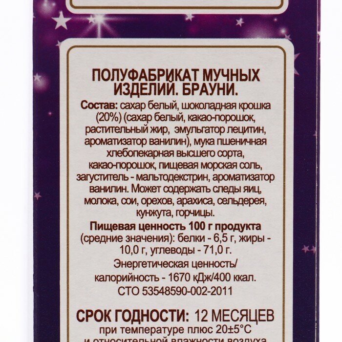 | Состав | сахар белый, шоколадная крошка (20%) (сахар белый, какао-порошок, растительный жир, эмульгатор лецитин, ароматизатор ванилин) мука пшеничная хлебопекарная высшего сорта, какао-порошок, пищевая морская соль, загуститель - мальтодекстрин, ароматизатор ванилин. Может содержать следы сои, орехов, арахиса, кунжута, сельдерея, горчицы. |