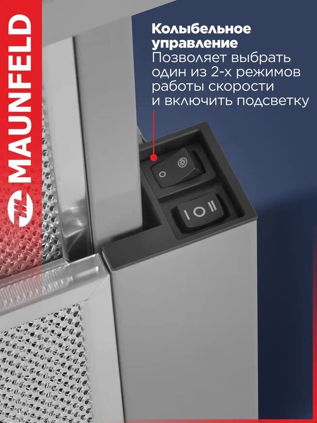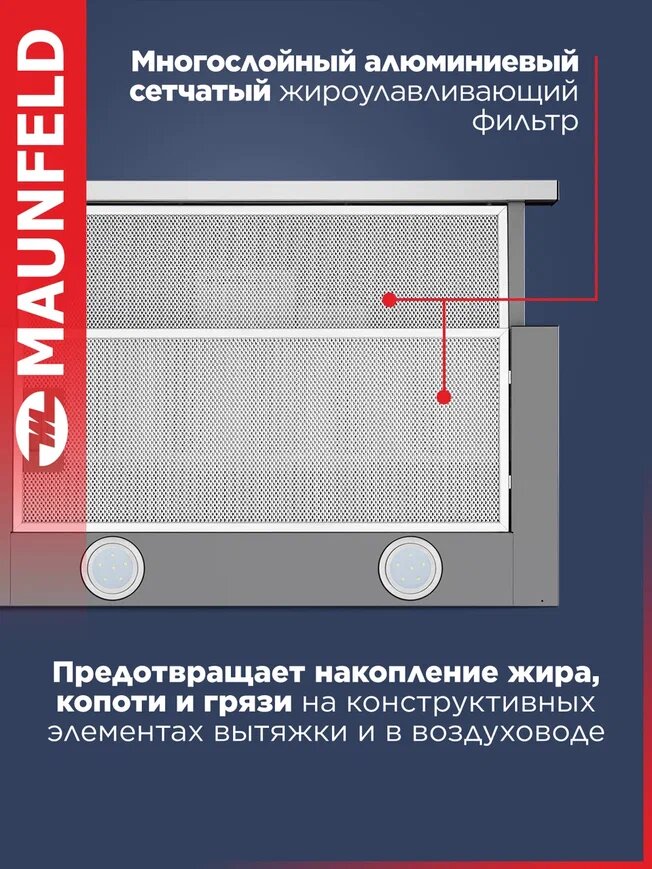 Вытяжка MAUNFELD VS LIGHT 50 – компактный и эффективный помощник для очистки воздуха! Благодаря красивому дизайну она идеально впишется в ваш кухонный интерьер. Наличие 2 скоростей позволит вам подобрать оптимальный вариант для вашей кухни. Благодаря множеству настроек мощности кухонной вытяжки и мощному мотору, можно наслаждаться эффективной работой вытяжки. Жировой фильтр защищает двигатель, вентиляторы и отводящие трубы от скопления мельчайших частичек жира, которые попадают в воздух во время приготовления пищи.