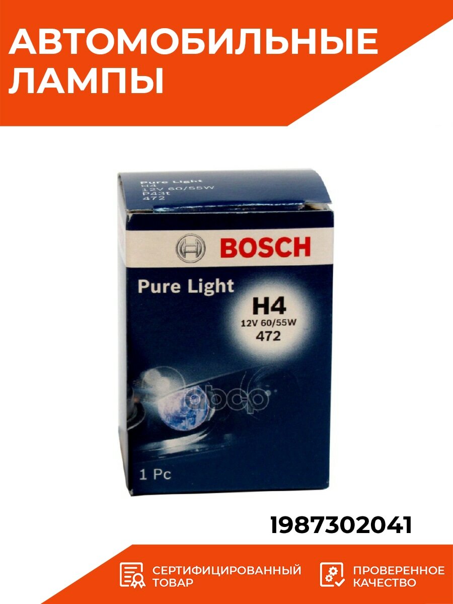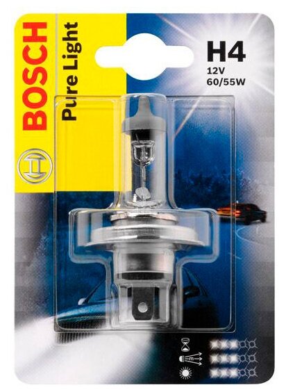 Галогенная лампа от компании Bosch серии Pure Light, создана я замены стандартного заводского света без потери эффективности света. Применяется для головной оптики Вашего автомобиля, а именно ближнего и дальнего света. Дают интенсивный свет фар, благодаря качественному материалу нити накаливания, что продлевает срок службы автолампы. Хорошая светоотдача повышается безопасность передвижения при любых погодных условиях и особенно ощутимый визуальный комфорт при путешествиях в ночное время.