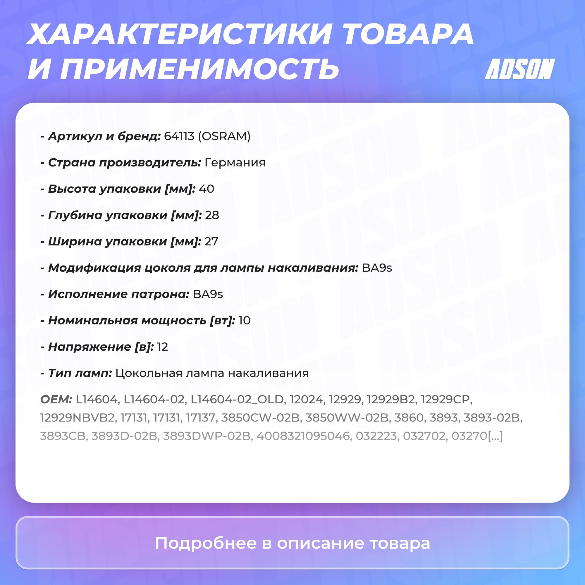 Тип товара: Автомобильная лампа