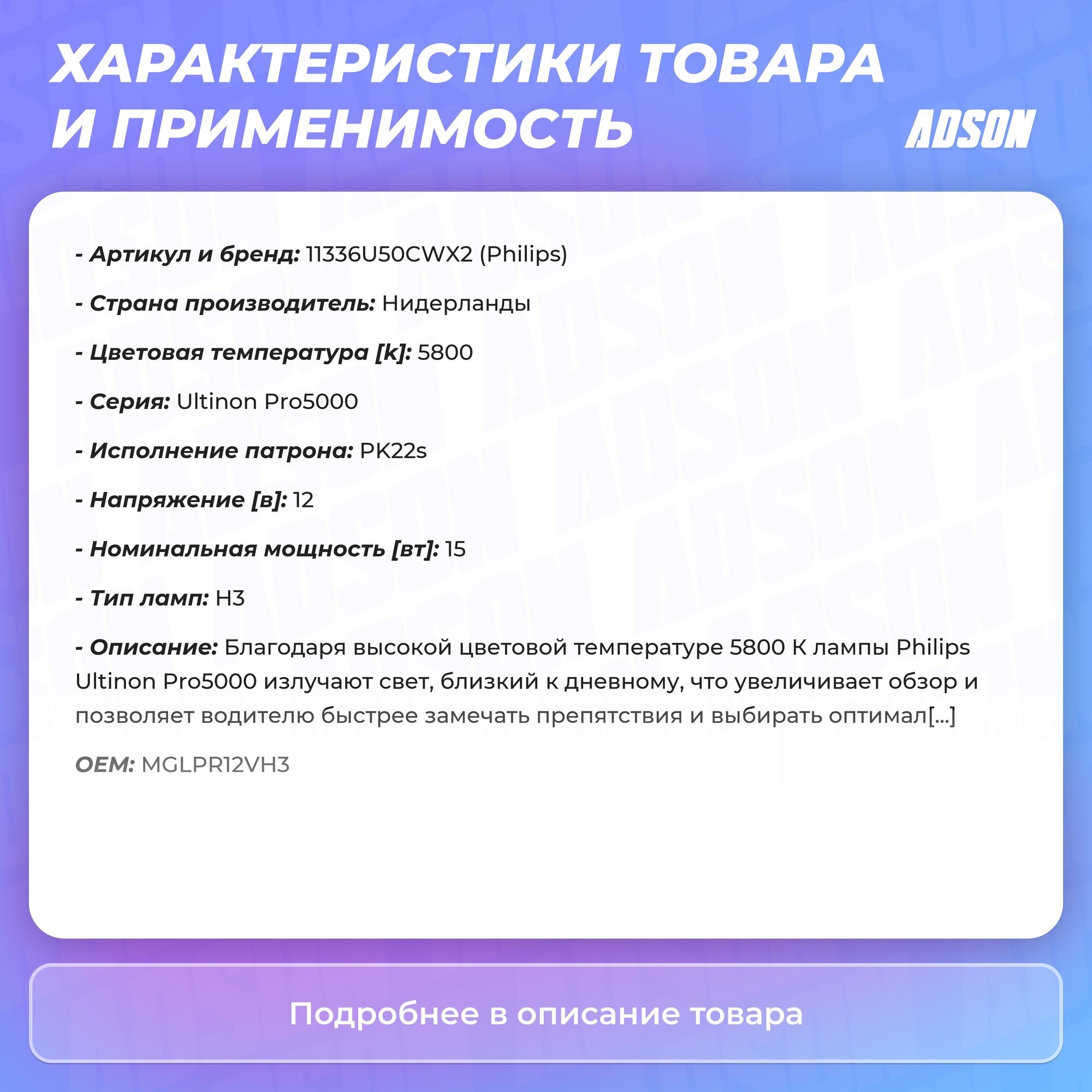 Благодаря высокой цветовой температуре 5800 К лампы Philips Ultinon Pro5000 излучают свет, близкий к дневному, что увеличивает обзор и позволяет водителю быстрее замечать препятствия и выбирать оптимальную траекторию для их объезда. Оптимальная цветовая температура также снижает нагрузку на глаза для более комфортного вождения в ночное время.