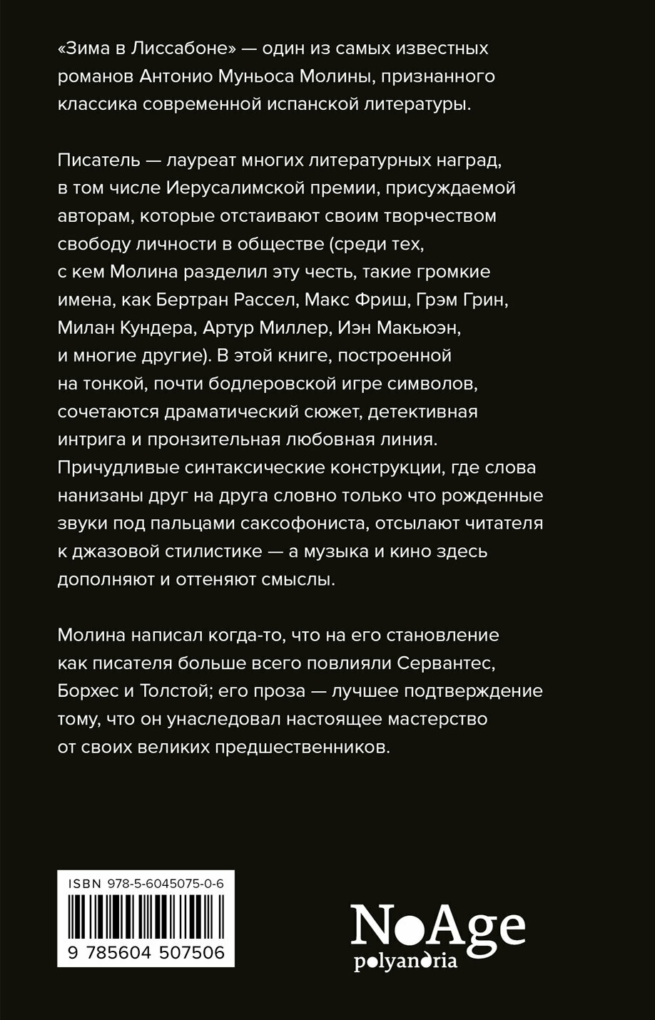 Можно было бы порадоваться, что у нас наконец после пятнадцатилетнего перерыва вышел ещё один роман Антонио Муньоса, если бы издательство со странным названием Polyandria NoAge хотя бы поняло, кого печатает. Однако в аннотации указано: Молина, Антонио Муньос (sic!).