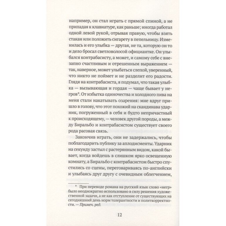 Для затравки присутствует вялый детективный сюжет, но он, на мой взгляд вовсе не важен. Бандиты , как и музыканты не менее яркие и универсальные персонажи, даже, я бы сказал, карикатурные. Многих такие произведения возможно бесят, они ждут динамики и событийности. Но, даже при их отсутствиии это очень серьезная, требующая сосредоточенности и вдумчивости книга, каковых не много. Ну, а кто не понял, то это их проблемы...