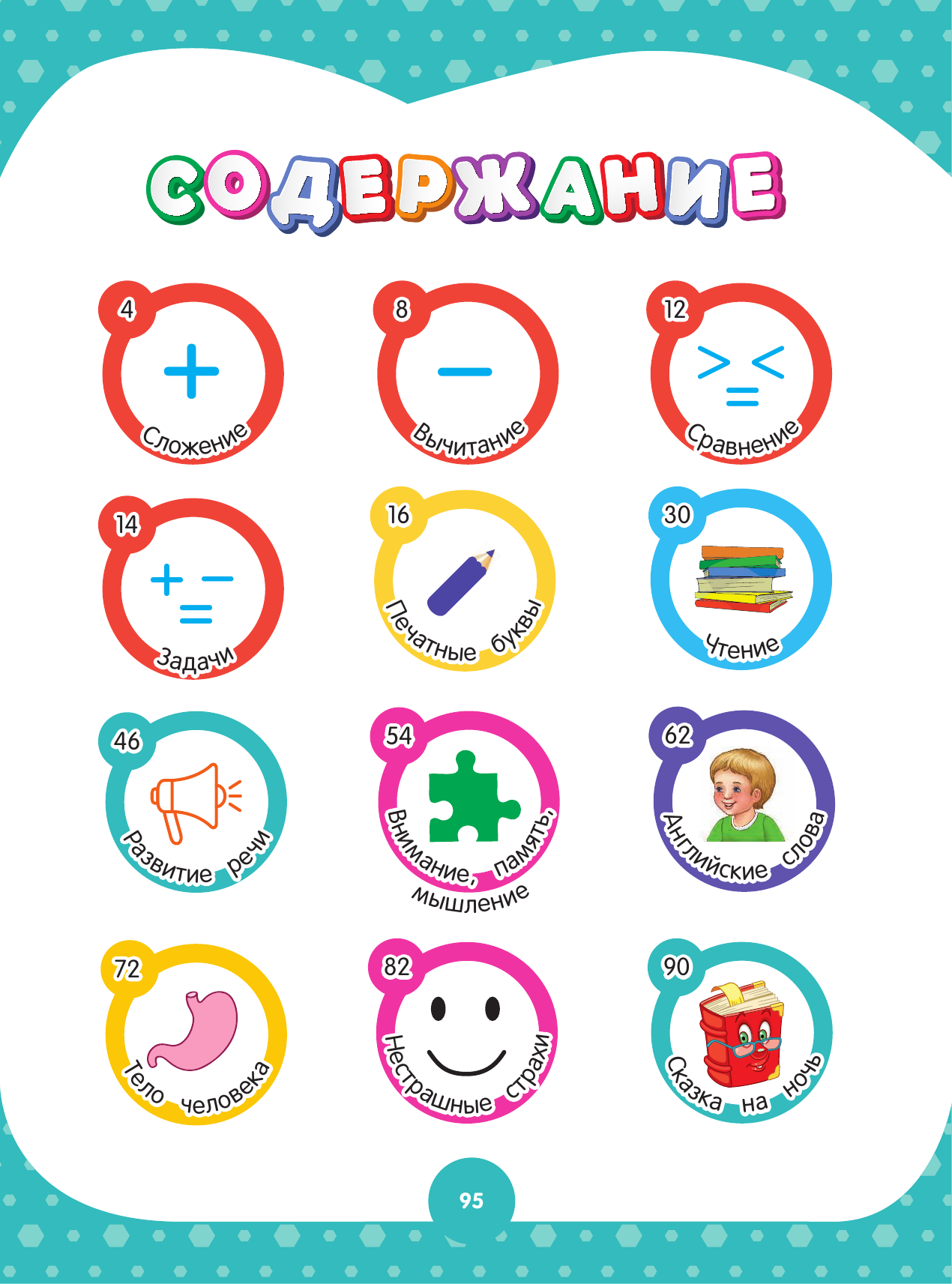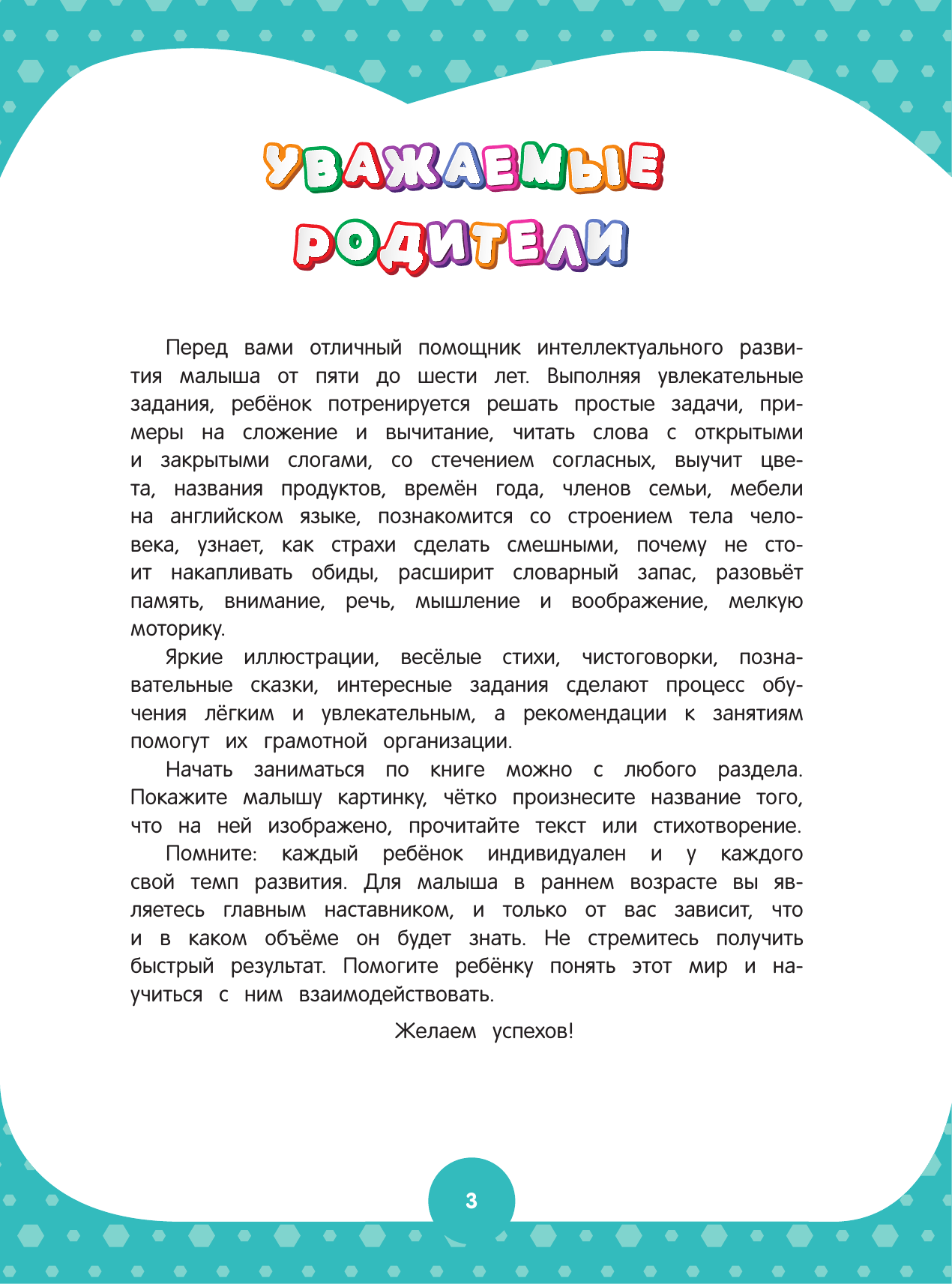 Основная цель пособия — комплексное развитие ребёнка 5-6 лет. Тематика включённых в книгу разделов соответствует ФГОС. Вместе с книгой дошкольник потренируется в решении простых примеров и задач, чтении слов и предложений, научится писать печатные буквы и цифры, узнает, как устроено тело человека, как звучат слова по-английски, расширит словарный запас, а также разовьет память, внимание, речь, мышление, воображение, графические навыки. Кроме того, в книге имеются рекомендации опытных педагогов и психологов, которые подскажут, как объяснять малышу новый материал, на что обратить внимание и как организовать занятия.