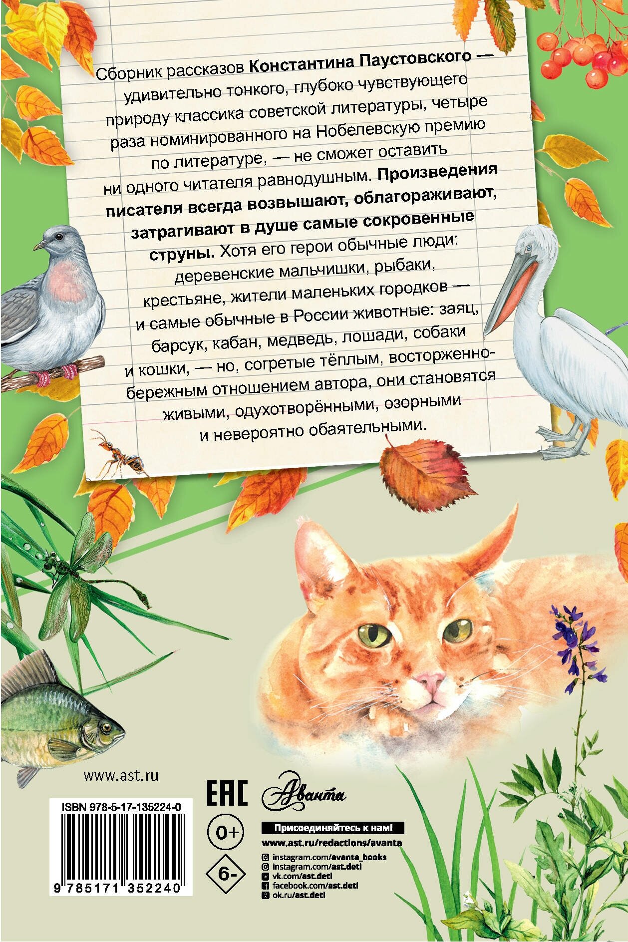 Сборник рассказов Константина Паустовского - удивительно тонкого, глубоко чувствующего природу классика советской литературы, четыре раза номинированного на Нобелевскую премию по литературе, - не сможет оставить равнодушным ни одного читателя. Произведения писателя всегда возвышают, облагораживают, затрагивают в душе самые сокровенные струны. Хотя его герои обычные люди: деревенские мальчишки, рыбаки, крестьяне, жители маленьких городков - и самые обычные в России животные: заяц, барсук, кабан, медведь, лошади, собаки и кошки, - но, согретые тёплым, восторженно-бережным отношением автора, они становятся живыми, одухотворёнными, озорными и невероятно обаятельными.