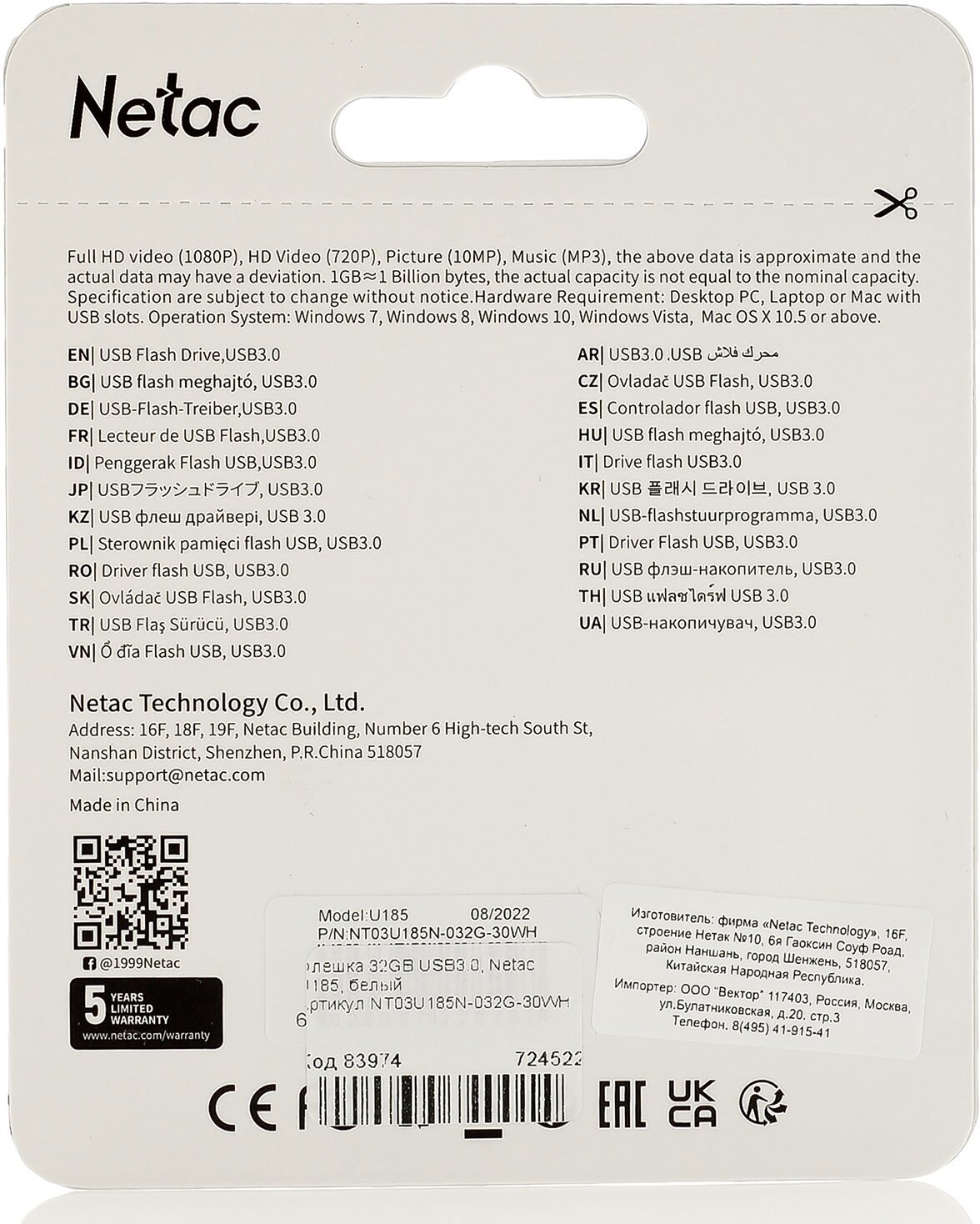| Наименование модели | U185 NT03U185N-032G-20WH 32Gb Белая |