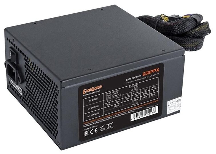 Блок питания 650W ExeGate (ATX, APFC, SC, КПД 80% (80 PLUS), 14cm fan, 24pin, (4+4)pin, PCIe, 5xSATA, 4xIDE, FDD, Cable Management, кабель 220V с защитой от выдергивания, black, RTL)