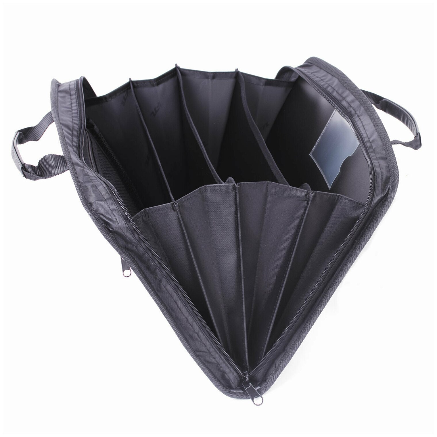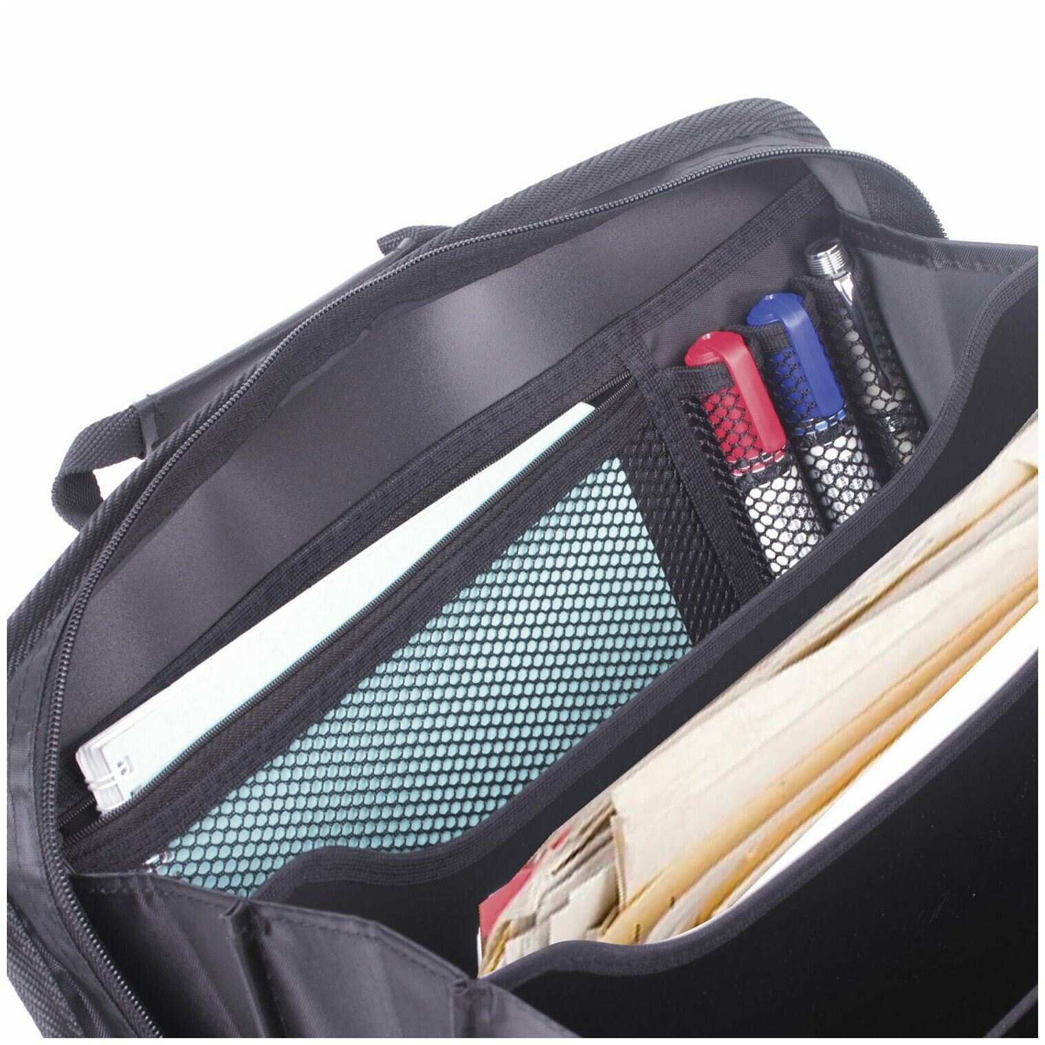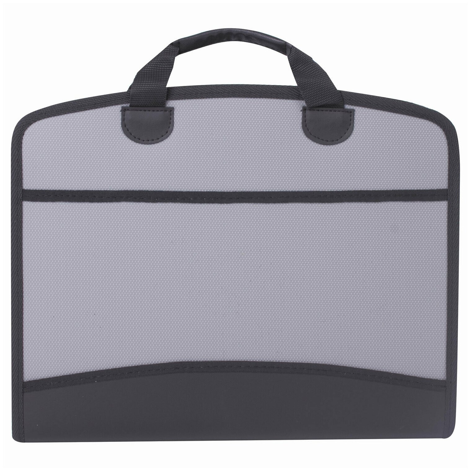 Портфель формата А4+ (390x260x40 мм) изготовлен из плотного пластика толщиной 0.7 мм, выполнен в солидном черном цвете с линейной фактурой и имеет 3 отделения. Складная ручка обеспечивает компактность изделия. Портфель застегивается на клапан. Края окантованы тканью с металлическими рейками по краям окантовки, что придает изделию презентабельный вид.