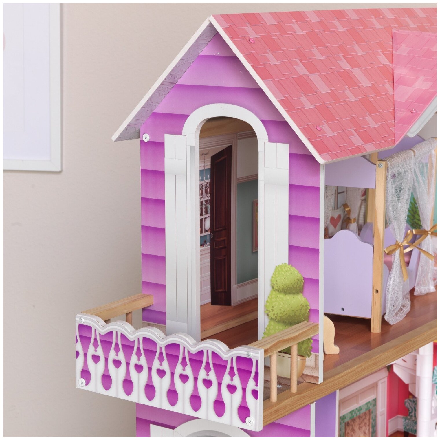 • Рекомендуется для мальчиков и девочек. • Возрастные рекомендации: от 3 лет. • 3-х этажный кукольный домик с деревянным каркасом, гармонично впишется в интерьер детской комнаты. • Задняя стенка дома глухая, а лицевая часть полностью открыта, позволяя ребёнку играть в нём. • Внутри домика расположено 7 комнат, чтобы подняться со 2-го этажа на 3-ий - можно использовать винтовую лесенку. • На 1-м этаже находится кухня-столовая и веранда, стилизованная под придомовую площадку для отдыха, на 2-м этаже расположена гостиная и ванная, на 3-м – спальня с роскошной кроватью с балдахином и шторами. • Чтобы придать уникальность интерьеру каждой комнаты, на деревянные стены нанесены красочные рисунки с изображением мебели, окон, штор и т.д. • В комплекте предусмотрена мебель, которой можно обставить комнаты на свой вкус: столик с 2 скамьями, раковинная для кухни, шезлонг, ванна и унитаз, диван, кровать с балдахином, вентилятор, манекен, собачка с миской, всего 13 предметов позволяющих расширить возможности игры. • Для увлекательной игры подойдет кукла высотой не более 30 сантиметров, места в доме хватит для целой семьи кукол. • Пошаговая инструкция по сборке прилагается • Примечание: Куклы в комплект не входят и приобретаются отдельно!
