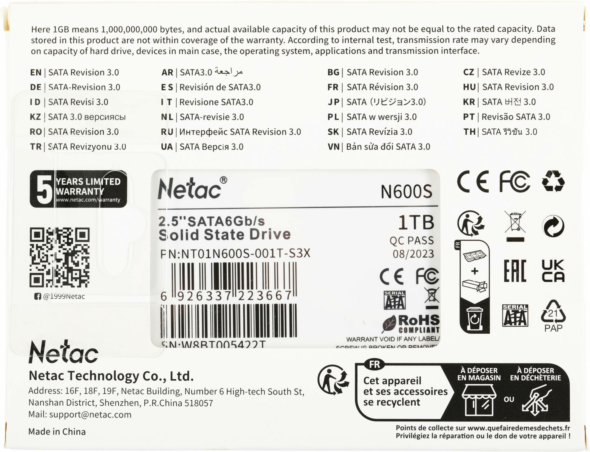 SSD накопитель NETAC N600S 1ТБ 2.5" SATA III SATA N600S NT01N600S-001T-S3X