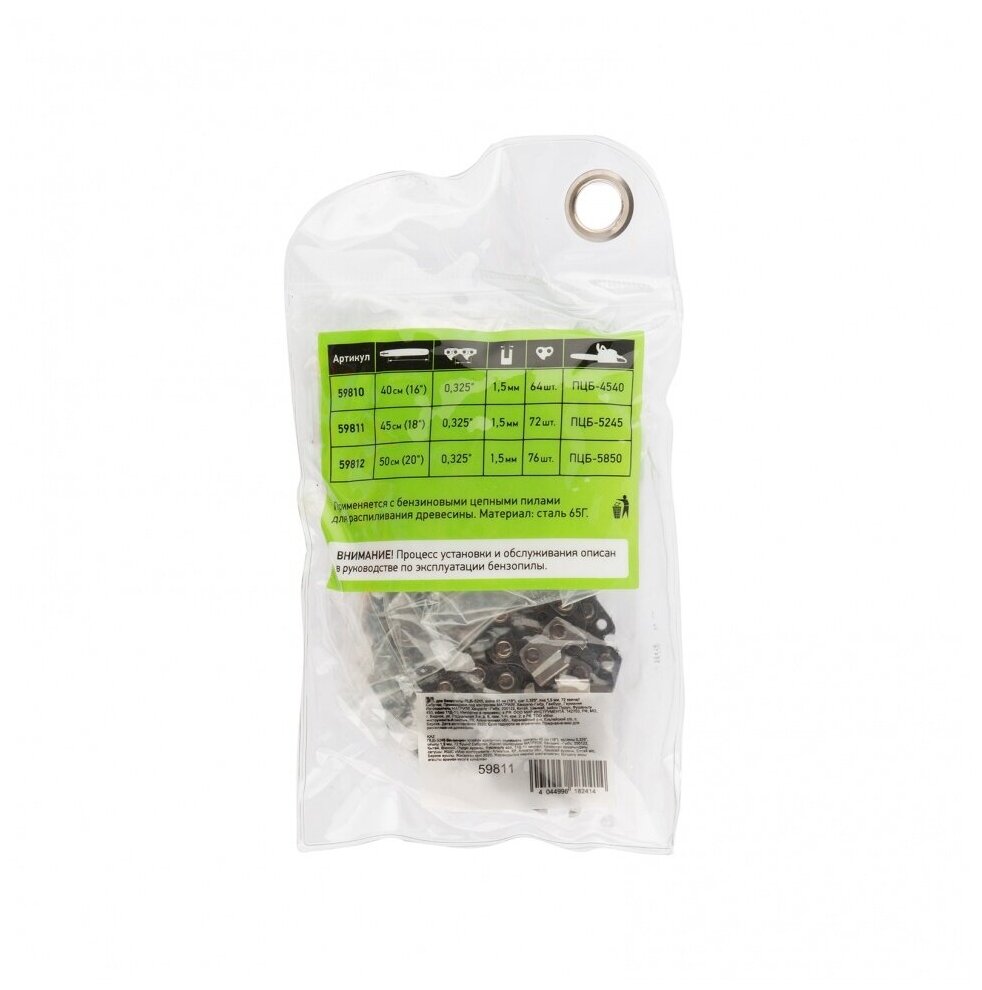 Цепь применяется с бензиновыми цепными пилами для распиливания древесины. Материал: сталь 65Г. Чипперный тип режущего звена, лазерная заточка, высокопрочная легированная сталь.