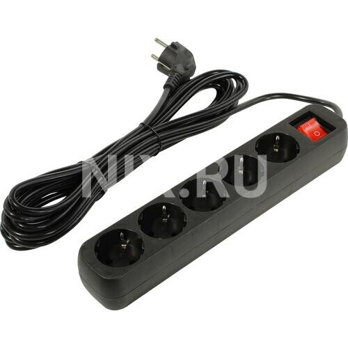 Удлинитель на пять розеток с выключателем питания и индикацией сети. Длина провода 5 метров. Предназначен для подключения бытовых электроприборов общей мощностью до 2200 Вт. Максимальный ток нагрузки 10 А. Все пять розеток с заземляющим контактом. Корпус удлинителя выполнен из негорючего пластика.