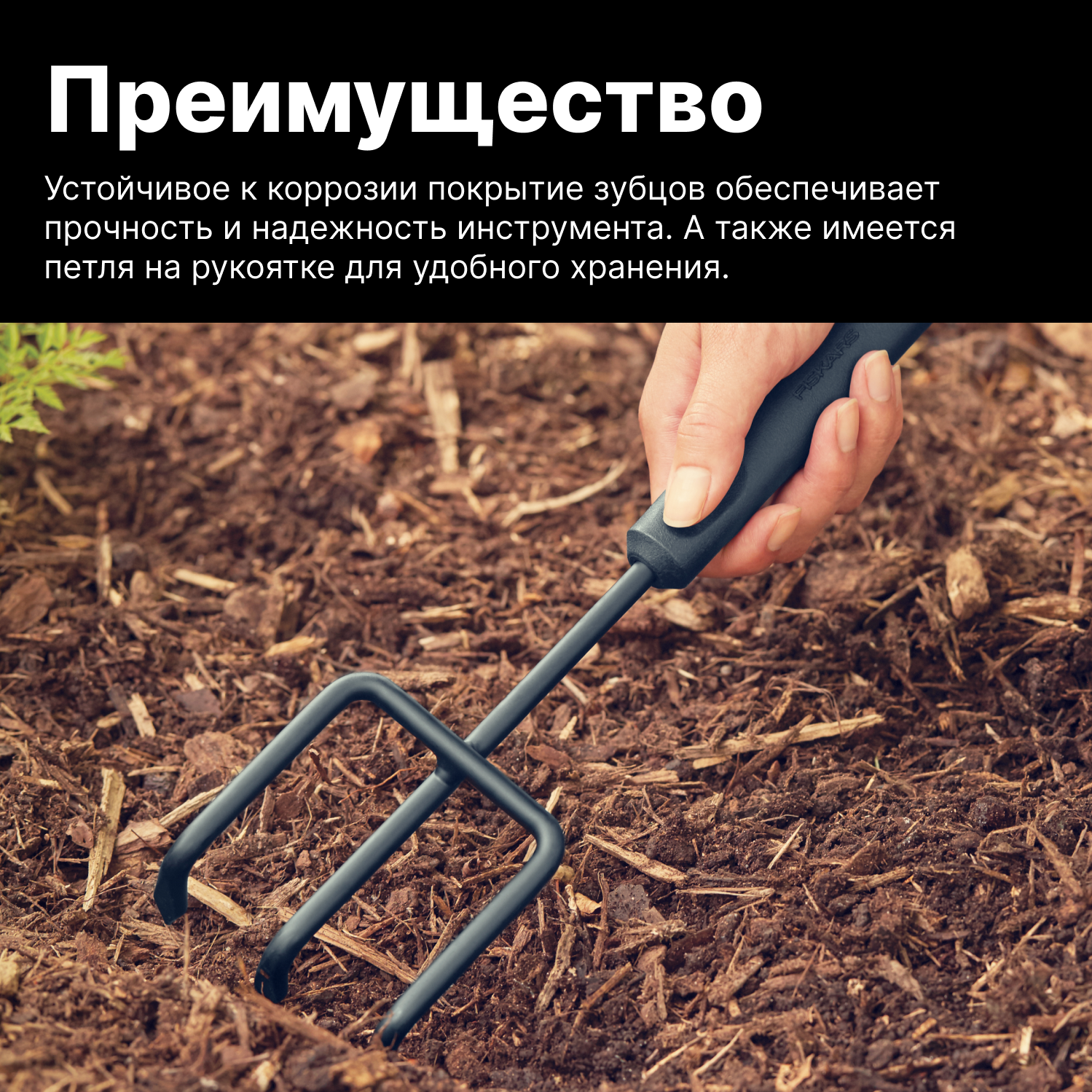 Культиватор подходит для разрыхления, аэрации твердой почвы и разбивания комков затвердевшей грязи. Стальные зубцы не сломаются при работе в твердой почве. Устойчивое к коррозии покрытие зубцов обеспечивает прочность инструмента. Легкая, эргономичная рукоятка естественно лежит в руке и не нагружает мышцы рук и спины при работе. Паз на рукоятке обеспечивает удобное расположение большого пальца. Петля на рукоятке для удобного хранения.