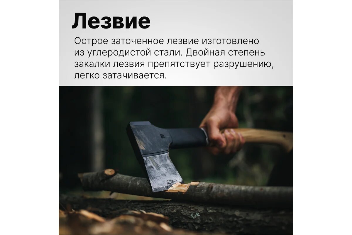 Заточка лезвия выполнена с помощью лазерных технологий под самым эффективным углом. При этом металл покрыт защитным антикоррозийным слоем. Благодаря этому топор легко раскалывает толстые бревна и никогда не застревает в древесине.