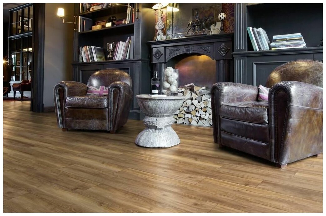 Поверхность материала с реалистичным рисунком сучков и прожилок имитирует структуру дерева. Светло-шоколадный оттенок и фаска по периметру увеличивают сходство с благородным дубовым паркетом.