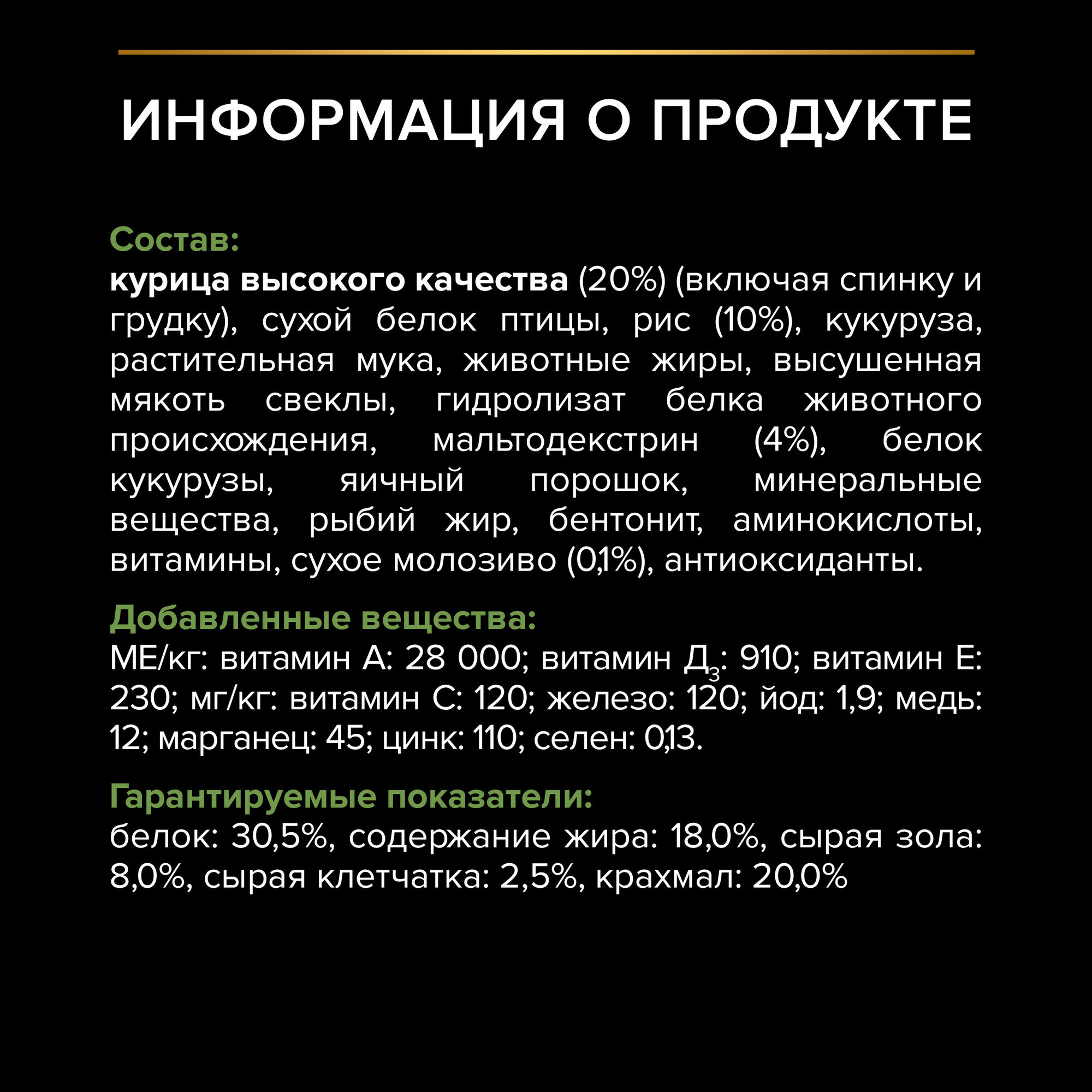 | Состав | Состав товара: курица (20%), сухой белок птицы, кукуруза, рис, соевая мука, животный жир, высушенная мякоть свеклы, гидролизат белков животного происхождения, мальтодекстрин (3.6%), кукурузный глютен, яичный порошок, минеральные вещества, кукурузная крупа, рыбий жир, бентонит, витамины, сухое моловизо (0.1%), антиоксиданты (токоферолы природного происхождения). Без добавления красителей. Содержит антиоксиданты природного происхождения. Добавленные вещества: белок |