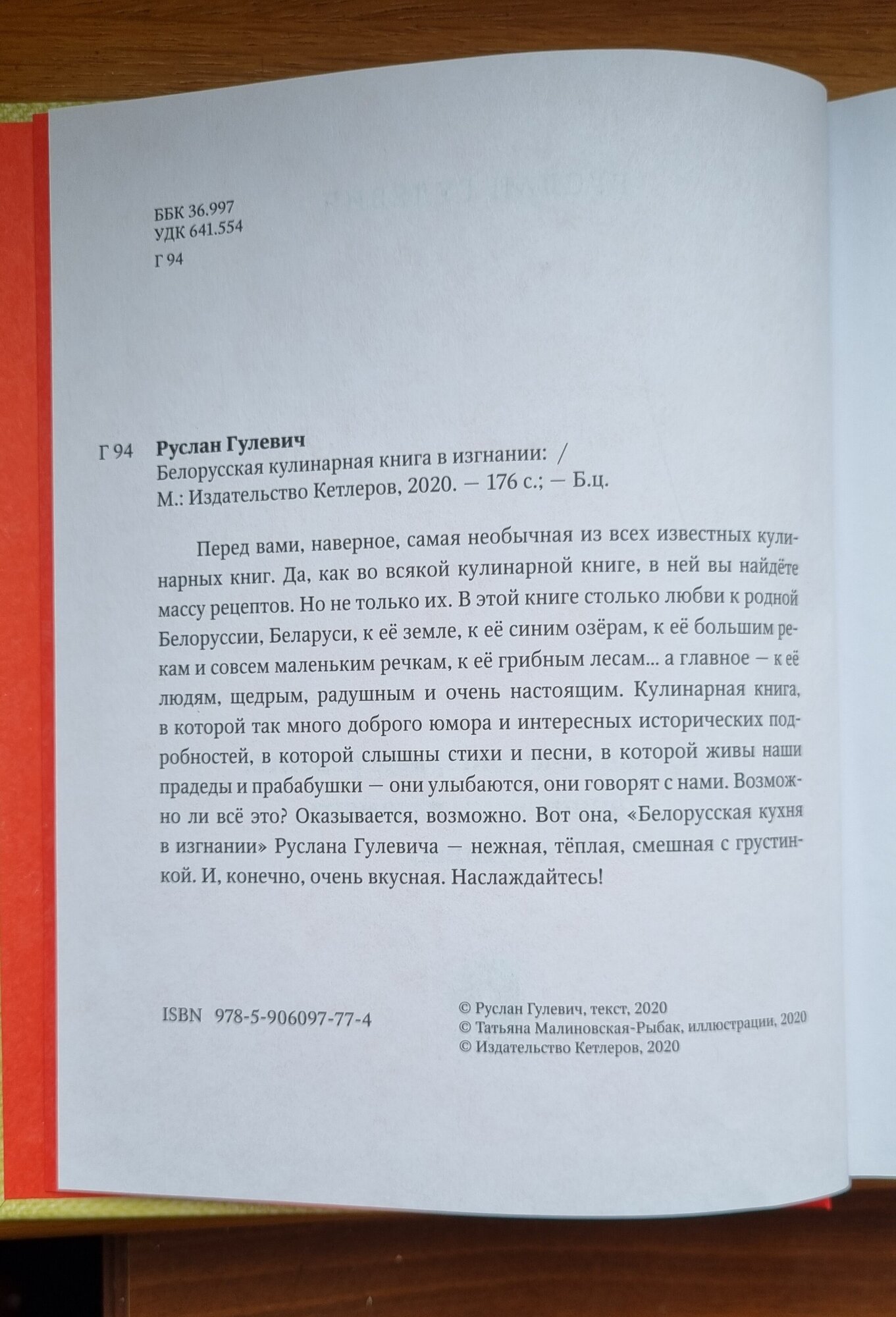 Перед вами, наверное, самая необычная из всех известных кулинарных книг. Да, как во всякой кулинарной книге, в ней вы найдёте массу рецептов. Но не только их. В этой книге столько любви к родной Белоруссии, Беларуси, к её земле, к её синим озёрам, к её большим рекам и совсем маленьким речкам, к её грибным лесам. а главное - к её людям, щедрым, радушным и очень настоящим. Кулинарная книга, в которой так много доброго юмора и интересных исторических подробностей, в которой слышны стихи и песни, в которой живы наши прадеды и прабабушки - они улыбаются, они говорят с нами. Возможно ли всё это? Оказывается, возможно. Вот она, "Белорусская кухня в изгнании" Руслана Гулевича - нежная, тёплая, смешная с грустинкой. И, конечно, очень вкусная. Наслаждайтесь!