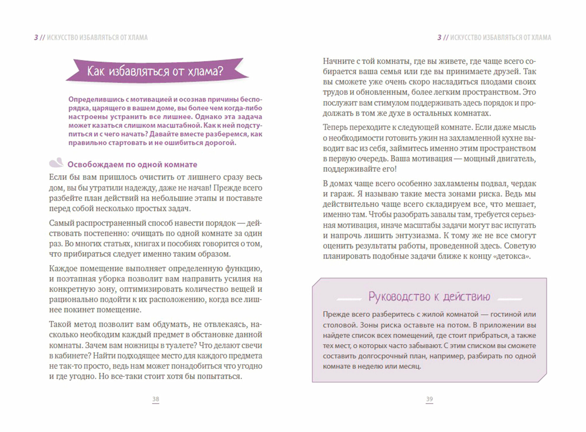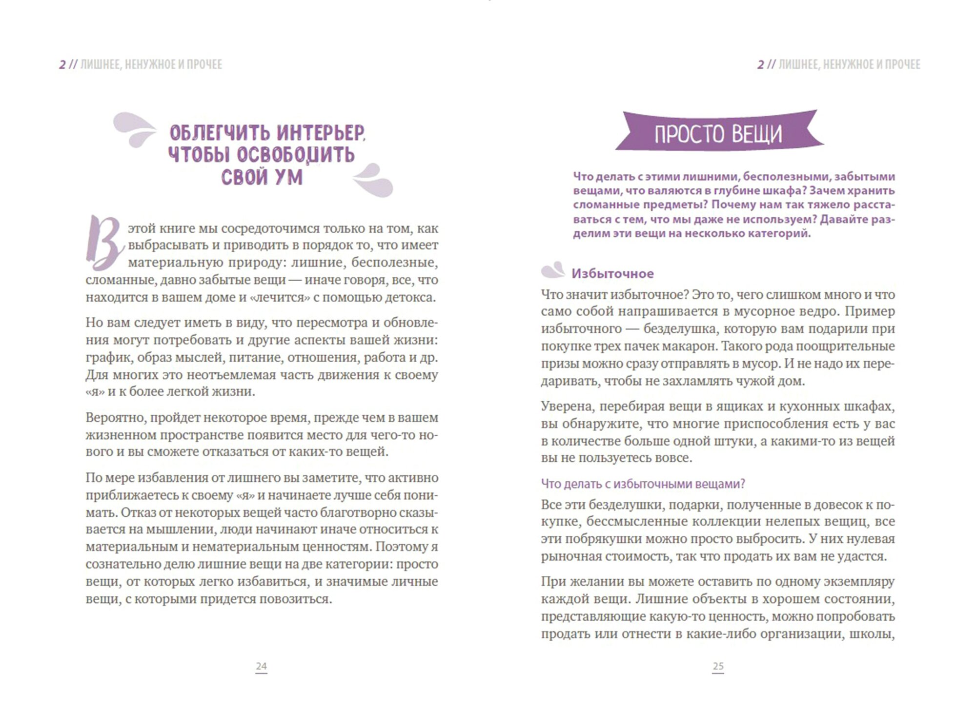 Книга очень понравилась! Реально мотивирует к уборке и расхламлению. Такая лёгкая, как пёрышко на обложке. И по весу, и при чтении. Есть разные полезные советы, и стоит недорого. Даже страницы вкусно пахнут) Рекомендую всем, но в особенности Плюшкиным, которые хотят изменить свою жизнь к лучшему)))