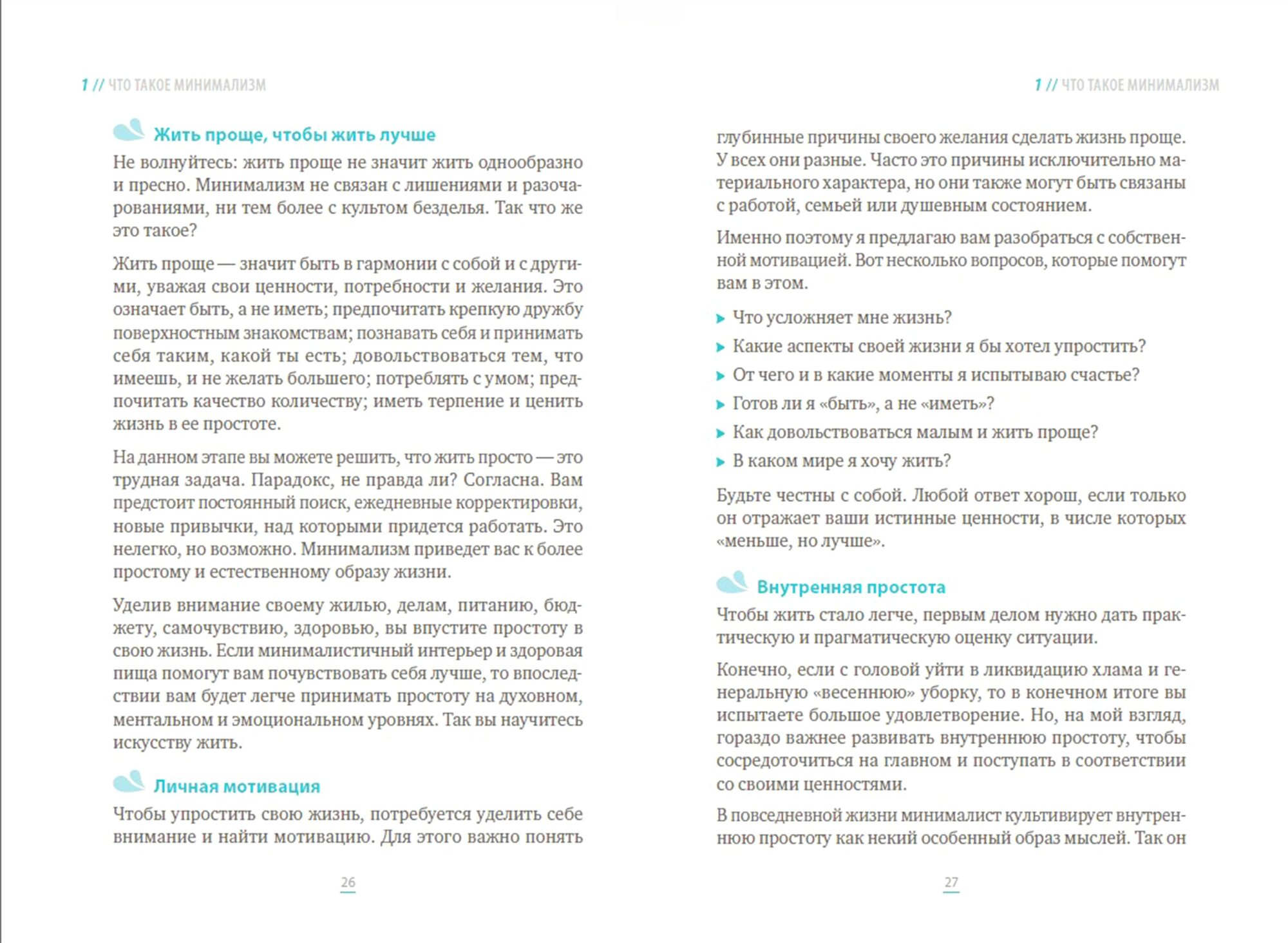 Приятно было прочитать в книге то, чему сознательно иду последние 10 лет. Каждый человек найдет здесь что-то свое. Я ращу троих детей и ищу правильные и простые решения жизненных ситуаций. Кто-то загнулся в работе и он остановится, вздохнет и подумает как дальше жить. Мы уехали в пригород, выращиваем свои овощи, есть куры и знаете, только здесь ощущаешь всю полноту жизни, при этом находишься от всех событий и городской суеты. Нет на каждом углу соблазнов и т. д.Действительно, чем проще, тем полнее жизнь!