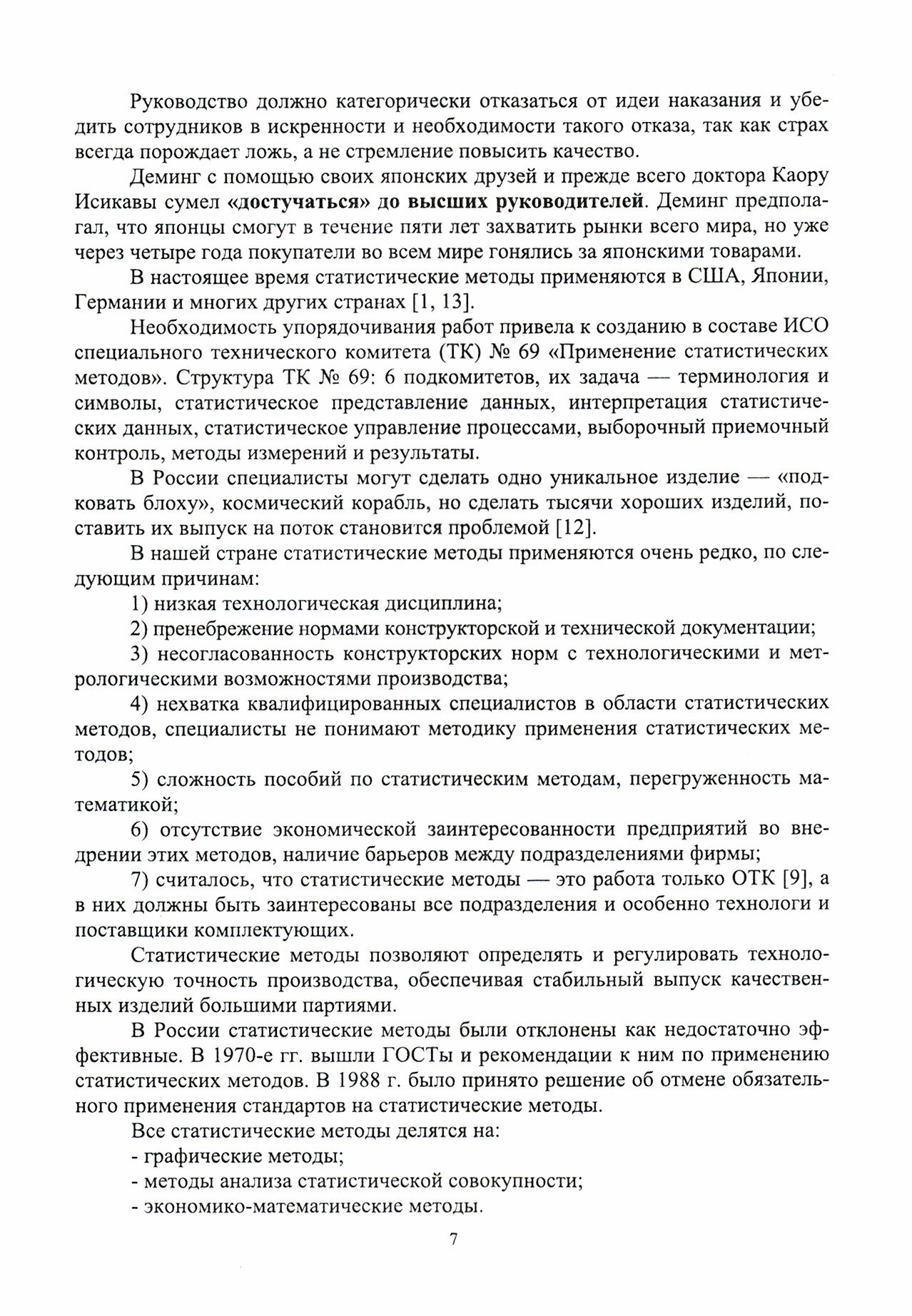 Рассматриваются основные термины и положения, отраженные в стандартах группы "Статистические методы", отмечена роль статистических методов в управлении качеством и в повышении конкурентоспособности продукции. Рассмотрены теоретические основы статистических методов, методы статического приемочного контроля, семь простых инструментов качества, довольно подробно выполнен анализ контрольных карт Шухарта, приведена методика оценки возможностей технологических процессов, рассмотрено использование методов статистического приемочного контроля по альтернативному признаку.
