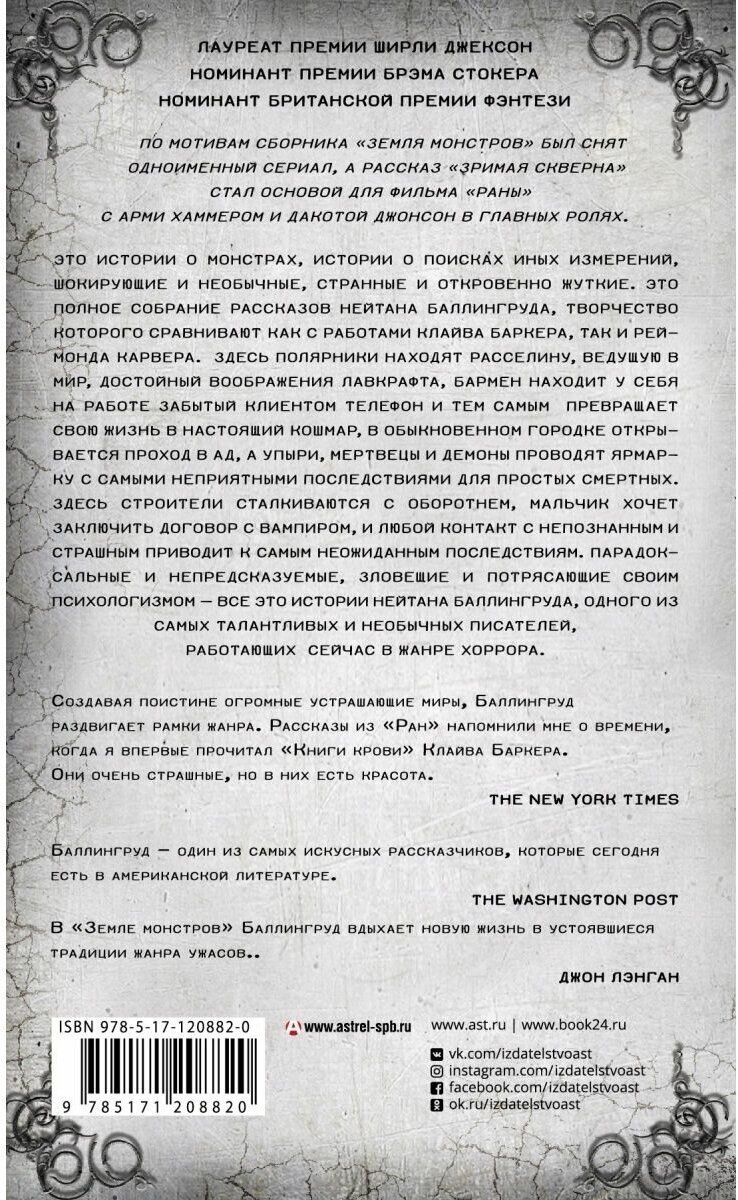 Мне нравится, что в серии "Мастера ужасов" публикуют не только романы, но и авторские сборники рассказов. Конечно, мы все ждём Адама Нэвилла, но и Баллингруд оказался отличным автором. Нужно заметить - "Раны" и "Земля монстров" - вещи очень разные, по настроению и по сюжетам. Тем, кто хочет кровавости и ужасов - тем точно зайдут "Раны" - настоящее путешествие по вполне реалистичному Аду, который вторгается на Землю. А "Земля монстров" - это рассказы, по большей части, о "монстрах внутри". Здесь тоже есть ужасы, но они для Баллингруда лишь точка отправления сюжета. Его интересуют немного иные вещи - порой кажется, что люди могут быть куда хуже некоторых монстров.