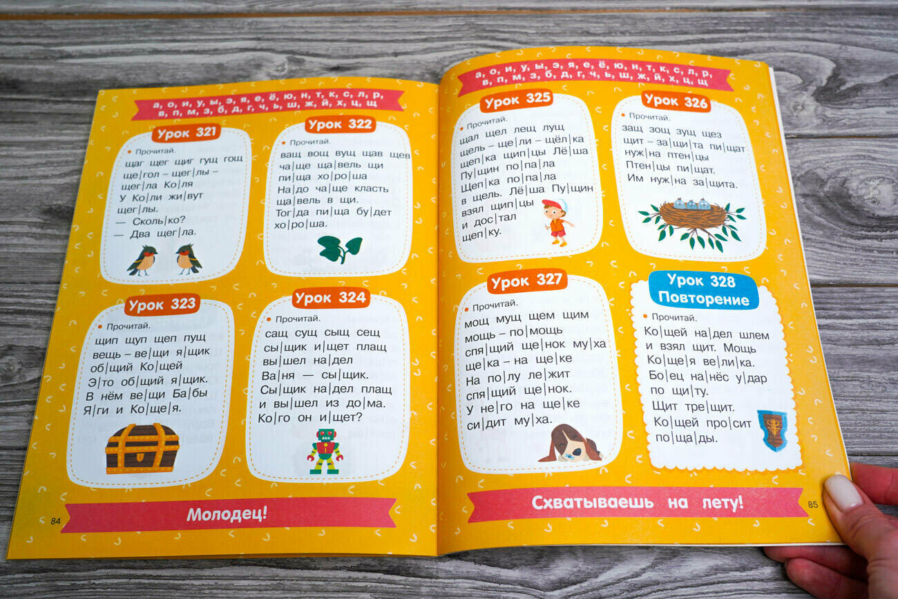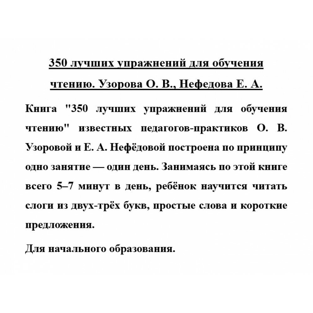 Книга «350 лучших упражнений для обучения чтению» известных педагогов-практиков О. В. Узоровой и Е. А. Нефёдовой построена по принципу одно занятие — один день. Занимаясь по этой книге всего 5–7 минут в день, ребёнок научится читать слоги из двух-трёх букв, простые слова и короткие предложения.