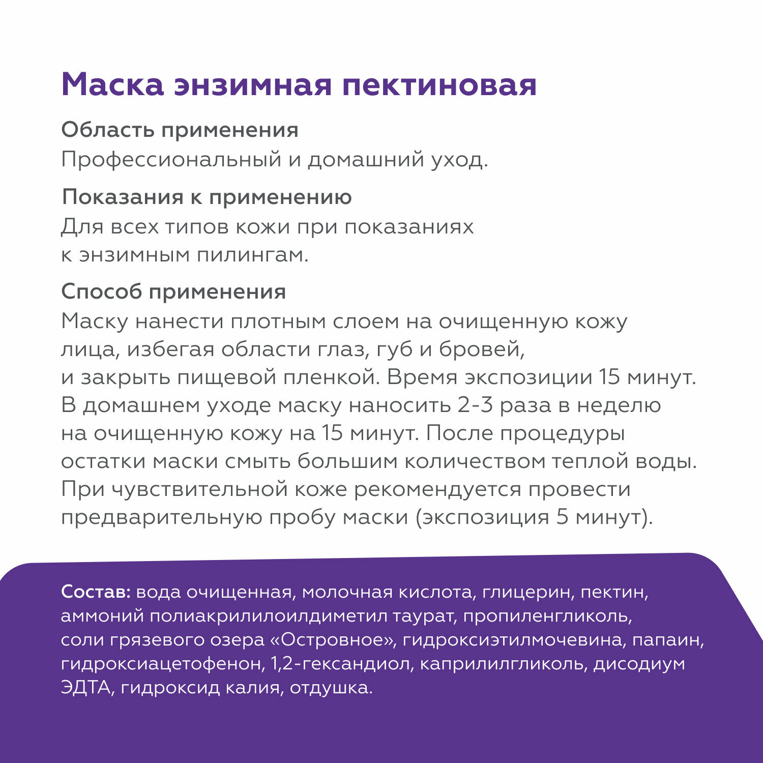 В аппаратной косметологии маска энзимная пектиновая используется в качестве «холодного распаривания» перед основной аппаратной процедурой. Использование маски заметно улучшает эффективность ультра-, электро- и лазерофореза. В домашнем уходе маска способствует естественному процессу пилинга, готовит кожу к тонизации и увлажнению, повышает эффективность косметических средств, которые будут нанесены на кожу после маски.
