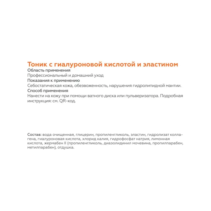 Тоник с гиалуроновой кислотой и эластином рекомендован для себостатической и чувствительной кожи. Сочетание высокомолекулярной гиалуроновой кислоты и эластина обеспечивает выраженное поверхностное увлажнение, а гидролизат коллагена не только восстанавливает дермальный матрикс, но и стимулирует естественную выработку коллагеновых и эластиновых волокон, значительно улучшая тургор кожи.