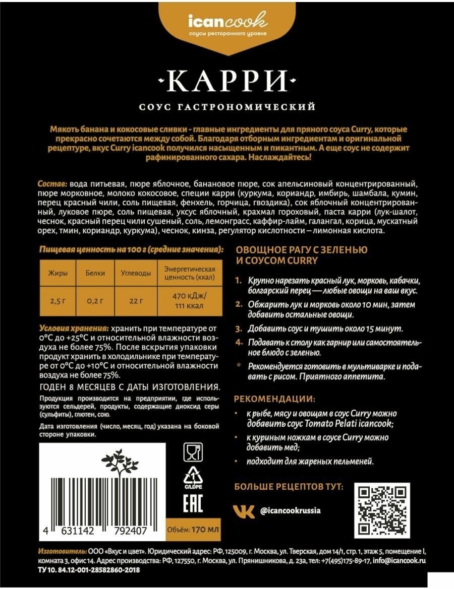 | Состав | вода питьевая, пюре яблочное, сок апельсиновый концентрированный, банан, сливки кокосовые, пюре морковное, специи карри (куркума, пажитник, кориандр, чеснок, красный перец сладкий, корица, имбирь, гвоздика, мускатный орех, кайенский перец, тимьян, тмин), сахар, лук, соль пищевая, уксус яблочный, крахмал гороховый, паста карри (красный перец, лук-шалот, чеснок, лимон, соль пищевая, порошок тмина, куркума, семена кориандра, пажитник), чеснок, кинза, экстракт сахарного тростника, регулятор кислотности – лимонная кислота. |