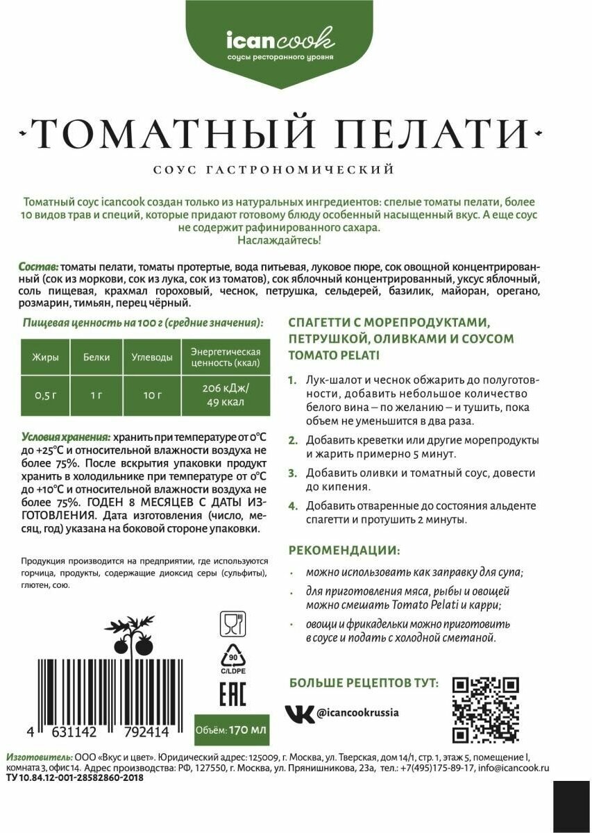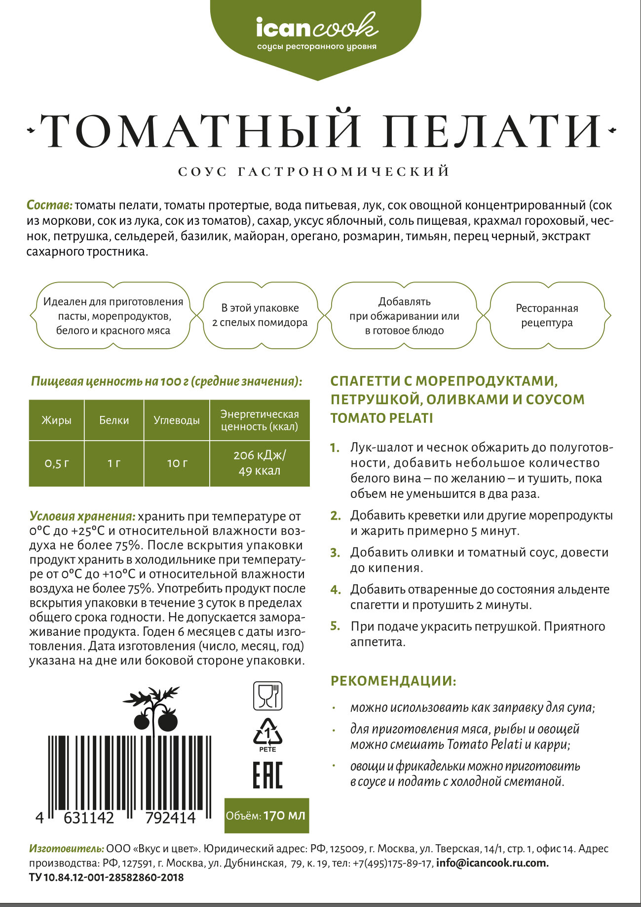 | Состав | томаты пелати, томаты протертые, вода питьевая, лук, сок овощной концентрированный (сок из моркови, сок из лука, сок из томатов), сок яблочный концентрированный, уксус яблочный, соль пищевая, крахмал гороховый, чеснок, петрушка, сельдерей, базилик, майоран, орегано, розмарин, тимьян, перец черный. |